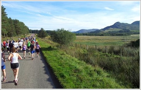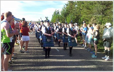 Doping po szkocku czyli kapela kobziarzyPierwsze kilometry staram się biec spokojnie, poniżej swoich możliwości. Pierwsza połowa maratonu biegnie z górki, ale w drugiej jest dwa, może nie duże, ale długie podbiegi. Moja taktyka zakłada więc przebiec pierwszą połowę trochę szybciej niż wynikałoby to z czasu jaki chcę uzyskać tak, aby zrekompensować sobie trudniejszą drugą połowę. Wokół mnie niesamowite "okoliczności przyrody": biegniemy cały czas wzdłuż jeziora (czyli loch języku gaelic) Ness, otoczonego niezbyt wysokimi górami, piękna słoneczna pogoda i super atmosfera wśród biegaczy i zagrzewających kibiców.