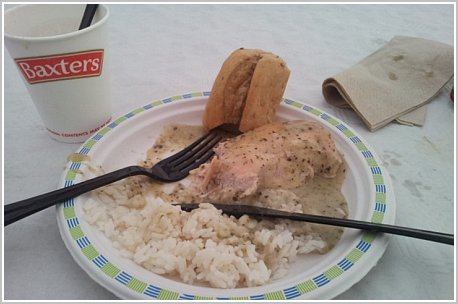 Zupa z puszki (rosół drobiowy) to produkt sponsora tytularnego maratonu – firmy Baxter’s: ciecz o przezroczysto-słomkowej barwie w której pływają sporadyczne kawałki jarzyn i jeszcze rzadsze nitki drobiu. Jedynym plusem tej ‘zupy’ jest to że jest ciepła dlatego zjadam ją nie marudząc i mając nadzieję, że ‘drugie’ będzie lepsze. Niestety. Nie jestem w stanie zjeść więcej niż kilka kęsów rozgotowanego ryżu i kurczaka. Nie dość, że kompletnie pozbawione smaku to jeszcze zimne. Brrrr...