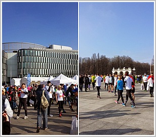 Po drodze na Pl. Piłsudskiego, gdzie mieściło się miasteczko zawodów, wyjrzało słońce. Doszłam więc do wniosku, że pewnie za ciepło się ubrałam. Zdecydowałam się na długie legginsy, koszulkę funkcyjną z długim rękawem plus wspominaną wyżej koszulkę z krótkim na wierzch. Poranne 5°C na termometrze i chmury nie zachęciły mnie do biegu na krótko, przecież jestem zmarzluchem;) Na szczęście oprócz czapki przeznaczonej na zimniejsze dni, wrzuciłam do torby moją czapkę z daszkiem. Kiedy jednak przy depozycie zdjęłam kurtkę, zdecydowałam się pozostać w długim rękawku. Choć świeciło słońce, wiał wiatr i było mi (delikatnie mówiąc) dość rześko. Cóż, klasyczny błąd nowicjusza, który musiałam potem skorygować w trakcie biegu ;)