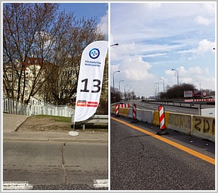 Odcinek biegnący Trasą Łazienkowską, między Rondem Jazdy Polskiej a zbiegiem w ul. Solec, wspominam bardzo dobrze. Chyba było wtedy trochę z górki ;) Szczęśliwie minęłam 13 kilometr i zrobiłam kilka fotek zamkniętemu Mostowi Łazienkowskiemu, przez pożar którego trasa biegu musiała niemal w ostatniej chwili ulec zmianie. Nie każdy pewnie zdaje sobie sprawę z tego, że atestowana przez PZLA trasa musi spełniać różne ściśle określone wymogi (np. musi posiadać określoną różnicę wysokości między startem i metą). Tym bardziej chylę czoła przed Organizatorami, że tak szybko udało im się opracować nową trasę. Moim zdaniem bardzo fajną trasę. Z doświadczenia w organizowaniu imprez związanych z częściowym wyłączeniem ruchu w mieście wiem, że załatwianie tego typu spraw wiąże się z solidną porcją papierkowej roboty, a działałam na znacznie mniejszą skalę. Chapeau bas!
