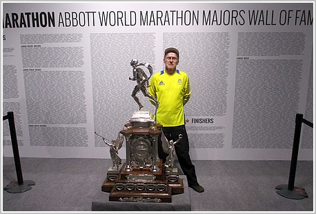 W niektórych miejscach indywidualni kibice częstowali biegaczy słodyczami czy cząstkami pomarańczy. Zbliżam się do centrum, biegnę wolniej, ale nie chcę stanąć. Pod koniec biegu piękny widok na Big Ben, jest już blisko mety, a od ostatnich 800 m oznaczenie jest co 200 m, ile do końca. Mijam pomnik przed Pałacem Buckimgham i wpadam na finiszową The Mall. Uzyskuję czas 3:23:33, mimo wcześniejszych perypetii z lewą łydką i związanymi z tym brakami treningowymi (w ostatnim m-cu przed biegiem wykonałem tylko 20% zaplanowanej mojej normy treningowej), uważam że uzyskałem całkiem przyzwoity czas. Chyba w maratonach z serii WMM biegam jak automat, bo różnice czasowe w moich maratonach między Bostonem, Nowym Jorkiem i Londynem wynoszą tylko 63 sek. Po finiszu medal wręcza mnie piękna młoda blondynka, następnie robię sobie pamiątkowe zdjęcie z medalem (fotograf z serwisu MarathonFoto).