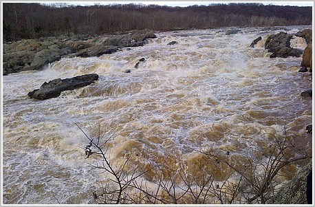 Wzburzony styczniowy Potomak na wysokości Great Falls, wzdłuż obu brzegów ciągną się milami piękne ścieżki biegowe
