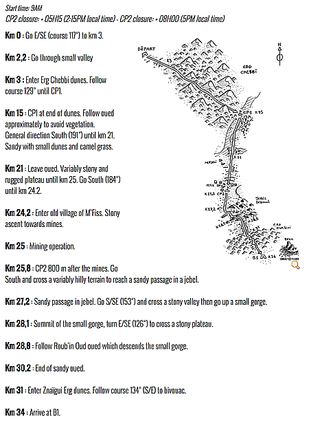Wystartowałem odważnie cele miałem żeby zawsze trzymać się w okolicach pierwszej 10-tki pierwszy 4 km po płaskim kamienistym podłożu, czułem się wyśmienicie biegliśmy w sporej grupie 10/12 zawodników po przebiegnięciu około 5 km zaczęły się mega wydmy piaskowe, które ciągły się przez nastepne 12 kilometrów. Na piasku czułem się mocny ponieważ grupa się rozpadła. Biegłem 5/6 razem z Marokańczykami, po 16 km zacząłem odczuwać trudy biegu, pierwszy check point była już za nami. Około 17 kilometra minął mnie Chema Martinez - sprzed laty mocny zawodnik z bieżni, tak jak z ulicy wynik życiowy na 10000m 27.30s