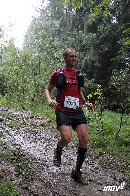 Skąd? Jak? Dlaczego? No nic, będzie kolejna wymówka. W sumie nie wiem, kto ma jakie kolki, ale moją da się przeżyć. Wbiegam do lasu, przebiegam przez polankę z ogromną ilością jagód, staram się uśmiechnąć do aparatu, który wyłonił się niespodziewanie. No ale już wiem, że na zdjęciu nie zobaczę luzu i radości, tylko grymas wskazujący na zaparcie od - co najmniej - kilku dni, ewentualnie - na śmierć ukochanego chomika. Na szczęście, nic mi nie dolega i nie mam chomika, po prostu moja mimika jest jakaś dziwna i zmęczenia nie jestem w stanie ukryć. Zbieg, zbieg, zbieg. Moja radość nie ma końca. Ale zaraz. Co to? Pojawią się jakieś postaci na trasie. Wyglądają inaczej, jakoś ciężej się poruszają, mają - zdaje się - pełniejsze plecaki, kije, kurtki, czapki, ulubione pluszaki... Wróć, bez pluszaków. To zawodnicy, którzy walczą od 4 rano na trasie, mój podziw dla nich miesza się ze współczuciem. Za Kotarzem zaczyna się podejście na Muńcuł. I tu zaskoczenie, dogania mnie jednak mój prześladowca i szybkim marszem ucieka pod górę. Stać mnie tylko na to, żeby się uśmiechnąć, życzyć powodzenia i krzyknąć mu w plecy, żeby gonił uciekającą trójkę zawodników, którzy zniknęli z mojego pola widzenia jeszcze na podejściu za Mładą Horą.