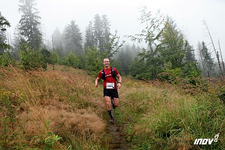Szybko znika z pola widzenia, dogania mnie jeszcze dwóch zawodników, reszta za mną już człapie podobnym tempem. Straciłem rachubę, nie wiem, na jakim miejscu mogę być. Trzymam się dwóch osób, od czasu do czasu podbiegam, ponieważ oni maszerują wyraźnie szybciej ode mnie. To też jest dla mnie zagadka do rozwikłania w najbliższym czasie - pod górę jestem po prostu wolny. Jak nie podbiegam od czasu do czasu, to rzadko udaje mi się osiągnąć pod górę wynik lepszy niż 10 min/km. W sumie, gdzieś mnie to cieszy, bo jest tak sporo do poprawy, że efekty tej poprawy na pewno będą widoczne. Tylko trzeba znaleźć właściwą metodę treningową. No właśnie, jakby to tak ułożyć, żeby było dobrze...? Tak się zamyśliłem nad swoim losem, że pomyliłem trasę. Z półsnu wyrwał mnie głos biegacza w czerwonej koszulce. Co się tu właściwie stało? Pomaszerowałem na wprost, podczas gdy szlak odbijał w lewo do Mładej Hory. Nie ma tego złego, właśnie mam kolejną wymówkę, jakby co. Zaczyna się łagodny zbieg, przyspieszam, uciekając i goniąc zarazem. Nie chcę już oddać swojej pozycji, jaka by nie była.