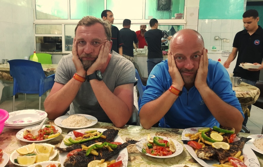Zgodnie z podróżniczą maksymą "żyw się tam gdzie jedzą tubylcy" za radą naszego przyjaciela z Wadi Rum udajemy się do jednej z bocznych uliczek słynącej ze sprzedaży świeżych ryb. Tuż obok sklepów usytuowanych jest wiele małych knajp w których jedzą okoliczni robotnicy. W efekcie tacy turyści jak my są tu prawdziwą sensacją - zwykle jedzą oni przy głównych ulicach w wykwintnych restauracjach płacąc 3-5 razy drożej. Możemy tu iść z pomocnikiem kucharza do sklepu obok i wybrać rybkę którą następnie przyrządzą nam w barze. Za jedną rybę, arabską sałatkę, zupę i wodę płacimy 6 JOD za osobę czyli 32 zł.