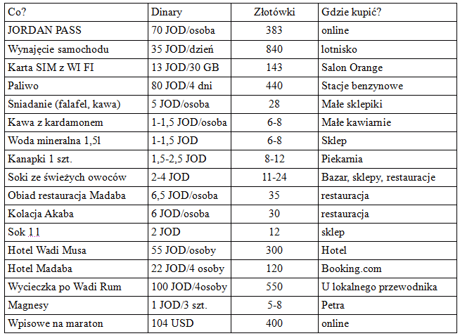 W tabeli przedstawiamy zestawienie wszystkich naszych wydatków. Ceny przeliczyliśmy po kursie 1 JOD = 5.5 PLN