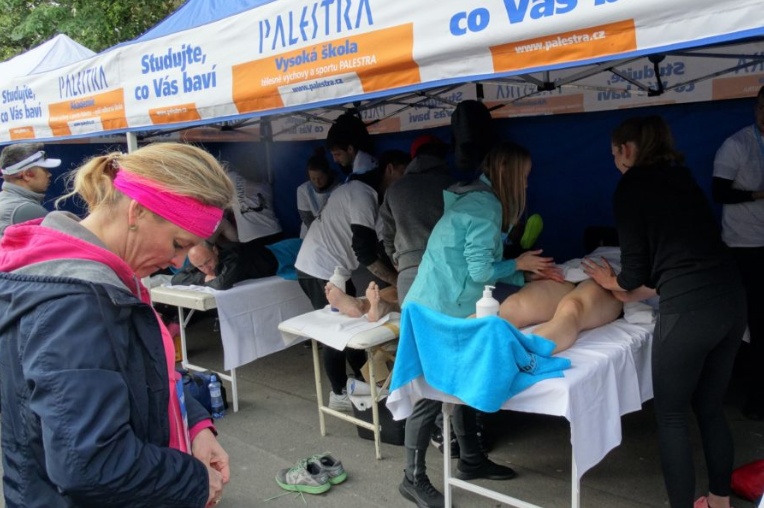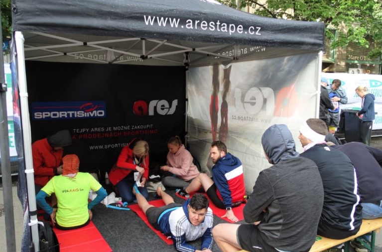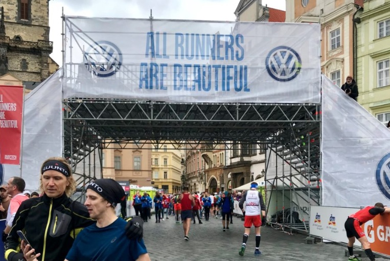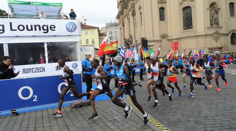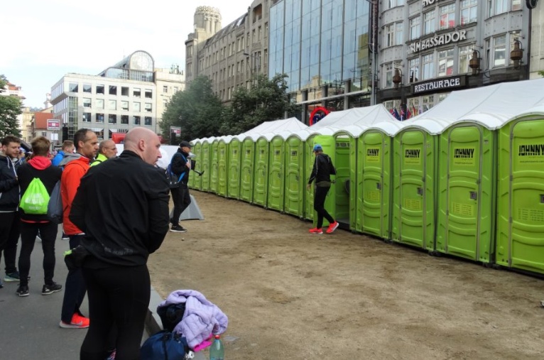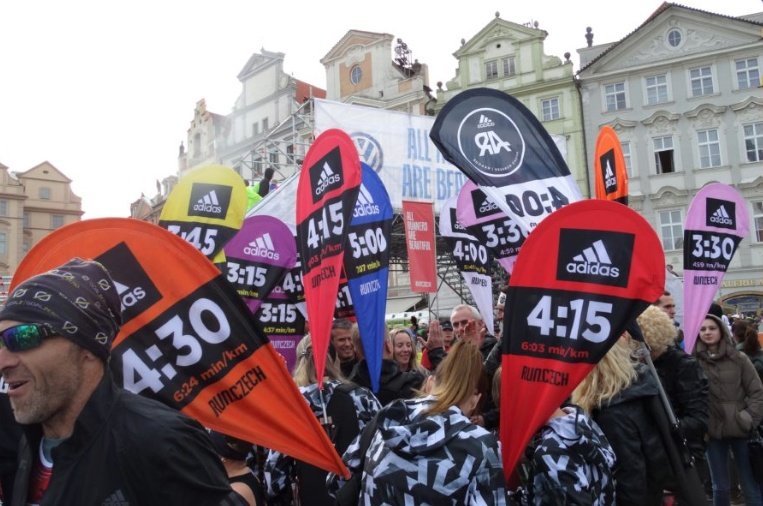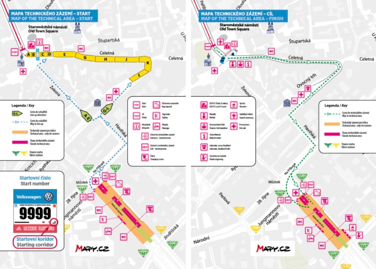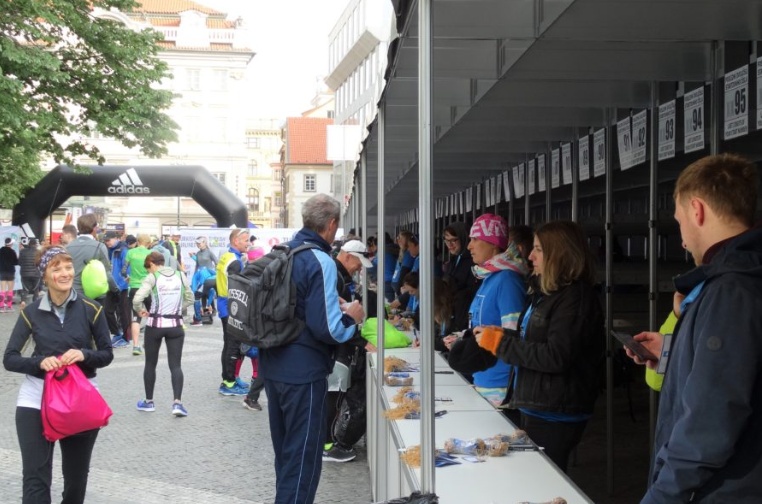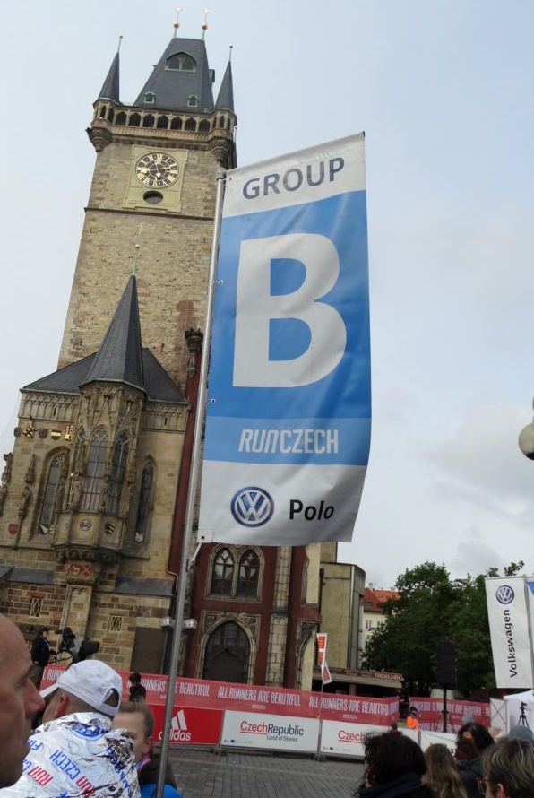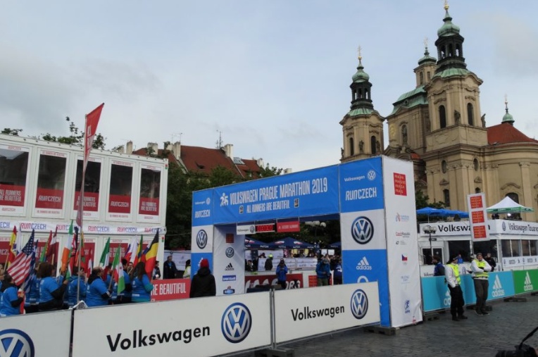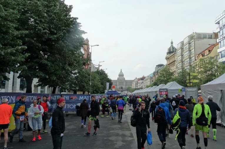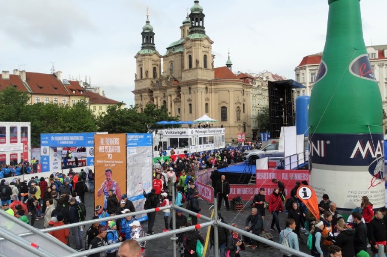 Szybko dotarliśmy do stacji metra, tam z różnych kierunków docierali biegacze, czekając na transport. W ciągu kilku minut dość mocno zatłoczonym metrem dojechaliśmy do stacji Mustek, przy której na placu Wacława organizatorzy zbudowali miasteczko biegowe. W tym miejscu biegacze mogli skorzystać z przebieralni, zostawić depozyt, poddać się masażowi nóg, tapingowi czy skorzystać z toalet. Całość miasteczka była ogrodzona i dostępna dla biegaczy po okazaniu numeru startowego. Chętnie zwiedziłem miasteczko biegowe zaciekawiony wielkością i organizacją tego terenu. Z depozytu nie skorzystałem, bazując na uprzejmości mojej partnerki. Skorzystałem natomiast z toalet, przed którymi nie było jeszcze dużych kolejek. Po opuszczeniu miasteczka biegowego i zapytaniu wolontariusza ze skrzydłem (podobnym do skrzydła na zbroi polskiej husarii, na którym współcześnie widniała literka „i” jak informacja) podążyłem we wskazanym kierunku na strefę startową maratonu, umieszczoną na Rynku Staromiejskim. Strefa startowa była oddalona od miasteczka biegowego dosłownie o kilkaset metrów. Niestety, całkowicie przemarzłem, było okropnie zimno, próbowaliśmy się ogrzać w pobliskich otwartych kafejkach, wszędzie było bardzo tłoczno. Bałem się o moją partnerkę, że się przeziębi. Po zorientowaniu się, gdzie była strefa startowa „B” i po zrobieniu kilku zdjęć mogłem się powoli rozgrzewać. Do startu pozostało pół godziny. W tym czasie na starcie/mecie zawodów przebiegała ceremonia prezentacji flag narodowych krajów, spośród których biegacze uczestniczyli w maratonie. Ściągnąłem kurtkę, pożegnałem się z Renatą i zacząłem się rozgrzewać. Już po kilku minutach zrobiło mi się cieplej. Rozgrzany dotarłem do swojej strefy startowej, gotowy do maratonu.