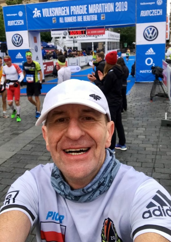 Po przebiegnięciu tunelu pozostawał mi do mety na Rynku Staromiejskim kilometrowy odcinek wzdłuż Wełtawy i po skręcie w lewo siedemset metrów po bruku. Moje tempo spadło do 4.17-4.22, ale walczyłem mobilizowany przez setki, może tysiące zgromadzonych kibiców. Zobaczyłem w tłumie przy barierkach Renatę, moją partnerkę, która starała się głośnym dopingiem mobilizować mnie na ostatnich metrach. Ostatnie dwieście metrów starałem się przyspieszyć, widziałem już zegar na konstrukcji mety maratonu i uciekające sekundy. Metę przebiegłem w czasie 2.59.00, a to był czas brutto. Złamałem wyśnione, upragnione TRZY GODZINY! Jestem szczęśliwy i nawet nie zmęczony. Wolontariuszka założyła mi medal na szyję, a ja zrobiłem sobie z nią selfie. Później, przesuwając się dalej, dostałem wodę i mogłem zrobić kilka zdjęć. Dzwoniła też do mnie moja partnerka, że złamałem trzy godziny, też się bardzo cieszyła z tego wyniku.