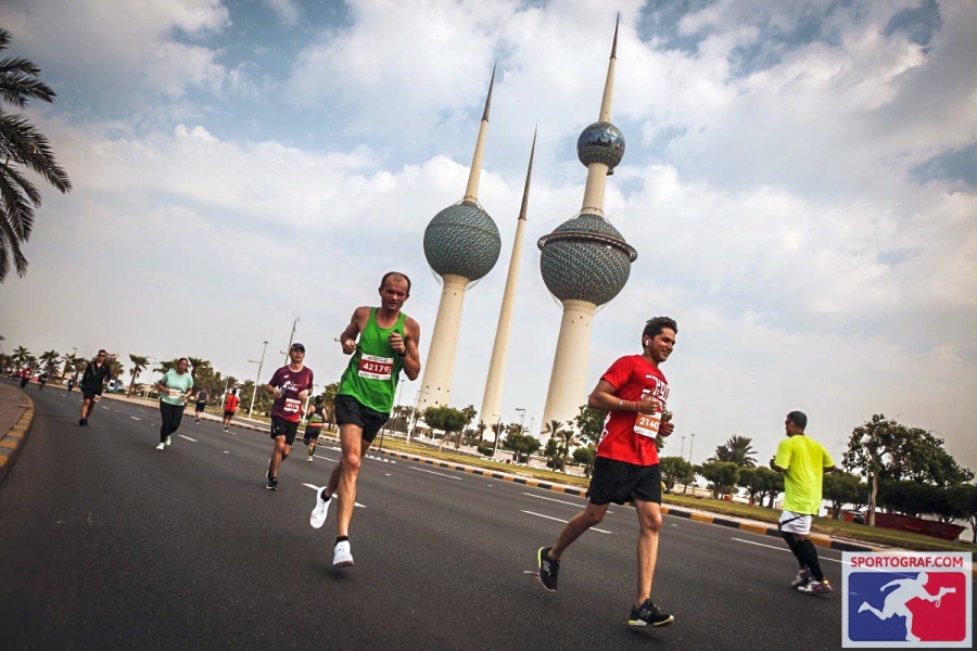 Maraton rozgrywany był na pięciu pętlach, przy czym pierwsza miała 14 kilometrów długości i prowadziła malowniczymi terenami miasta, w tym arabskim sukiem czyli targowiskiem. Zapowiadał się mega klimat, ale niestety kolejne pętle, tym razem 7-kilometrowe, były już nudne niczym puszka sardynek. Trzy i pół kilometra naprzód, nawrót, trzy i pół kilometra naprzód, nawrót... i tak cztery razy. Przy drugiej małej pętli już się nawet nie chciało patrzeć na odległą o kilkadziesiąt metrów Zatokę Perską ani na dumnie wznoszące się Kuwait Towers, czyli imponujące wysokością trzy strzeliste wieże z których spoglądał na nas uważnie sam Szejk Szejków, czyli Sabah al-Ahmed al-Sabah.
