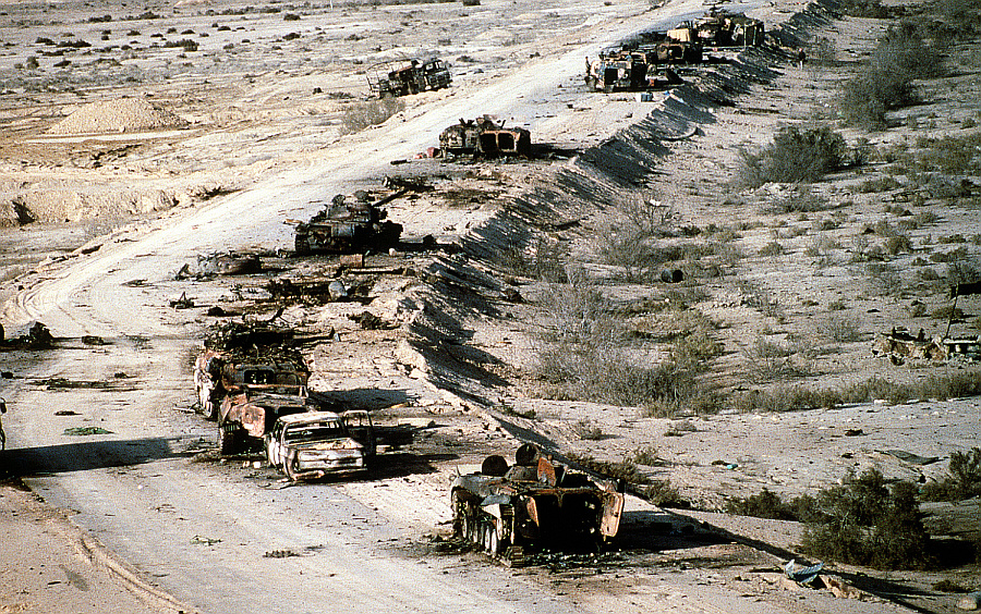 Iracka kolumna zmechanizowana zniszczona podczas Pustynnej Burzy w lutym 1991 roku. Źródło: Wikipedia, domena publiczna, DoD photo by Staff Sgt. Dean Wagner