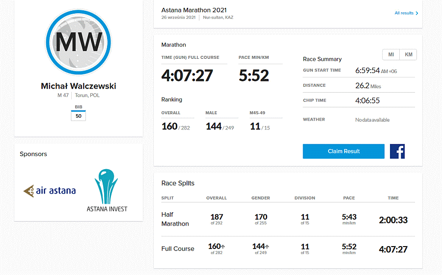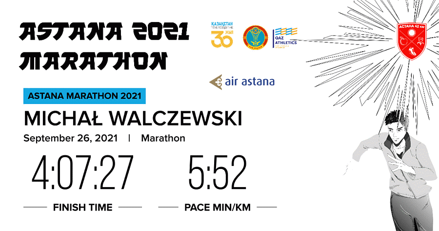 Jaki był Astana Marathon 2021? Maraton rozegrany w Nur-Sułtan był nadspodziewanie świetnie zorganizowany. Śmiało mogę go porównać do najlepszych biegów organizowanych w naszym kraju. Choć w tym roku uczestniczyło w nim bardzo mało osób (zaledwie 282 finiszerów na dystansie maratonu i nieco ponad półtora tysiąca na dystansie 10 km) to całe wielkie miasto należało do biegaczy. Pozamykane, świetnie zabezpieczone, szerokie kilku-pasmowe drogi. Ciekawa trasa wiodąca przez sporą część miasta. Brakowało tylko dopingu – co oczywiście wynikało z covidowych obostrzeń. I co ciekawe – było bardzo zimno. Zimno oczywiście jak dla nas, bo na Kazachach temperatura 1-4 stopni panująca na trasie nie robiła żadnego wrażenia. Ja jednak zmarzłem, ale dzięki temu uzyskałem najlepszy tegoroczny czas netto – 04:06:55