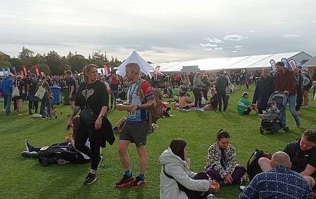 A po mecie już tylko przyjemności. Medal, całkiem ładny (z potworem w środku), na pasku w szkocką kratę, został włożony na moją szyję przez młodziutką wolontariuszkę. Później torba z owocami, woda, czarny T-shirt z potworem na boku i schłodzone, bezalkoholowe, niemieckie piwo Erdinger. Po tylu żelkach, izotonikach zimne piwo smakowało wybornie, tak samo zresztą jak zupa tytularnego sponsora (Baxters), serwowana z bułeczką. W ten weekend odbyło się przy okazji maratonu szereg innych biegów: na 5 km, na 10 km, bieg korporacyjny, stąd na terenie Bought Park było mnóstwo biegaczy, osób towarzyszących. Pogoda sprzyjała, było trochę cieplej, niż rano. Strzelam jeszcze trochę fotek przy alei finiszowej i wracam na piechotę do swoich gospodarzy.
