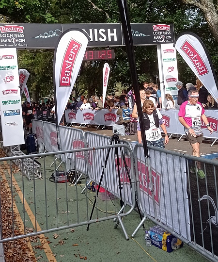 Ostatnie dwie mile to już trasa w miasteczku. Najpierw z lewej strony rzeki Ness przecinającej to miasto (około 50 tys. mieszkańców), a później finiszowa aleja do mety z prawej strony. Staram się, jeszcze na ostatnich metrach wyprzedzić kilku biegaczy i wpadam na metę z czasem brutto 4:00:35. Wiem że czas netto będzie lekko powyżej 4 godzin. Zabrakło tylko 14 s (słownie: czternaście sekund). Do dzisiaj „pluję sobie w brodę”, dlaczego tyle przerw wcześniej zrobiłem, bo na sam finisz zachowałem trochę siły. No cóż, z losem trzeba się pogodzić.