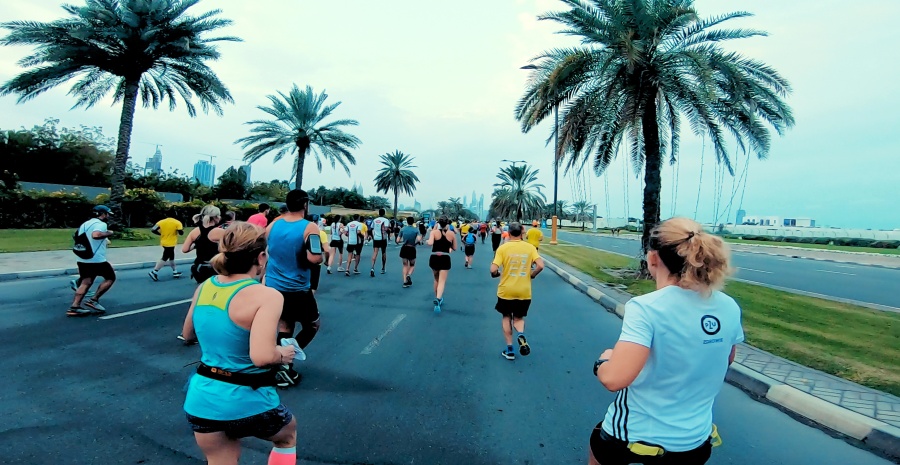 Trasa maratonu w Dubaju jest niewątpliwie szybka; tak szybka, że elita startuje o godzinę wcześniej niż kilka tysięcy podążających za nią biegaczy – amatorów. Dla ścigaczy start o godzinie 6:00 rano jest także dodatkowym wsparciem przez szybko rosnącą temperaturą; biorąc pod uwagę, że spędzą oni na trasie tylko nieco ponad dwie godziny, to na mecie meldują się chwilę po godzinie ósmej, a wiec jeszcze rano. My – naziemne leniwce – startując o siódmej rano na metę docieramy w większości pomiędzy 11:00 a 12:00 w południe, a więc wtedy, kiedy słońce stoi już w zenicie. Średnio to sprawiedliwe… choć z drugiej strony i tak przecież elity bym nie dogonił.