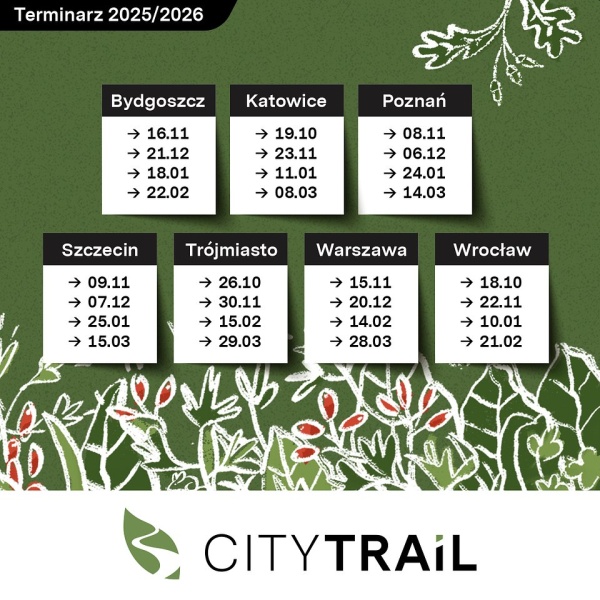 CITY TRAIL to największy cykl imprez przełajowych w kraju. Biegi są rozgrywane w okresie jesienno-zimowym, na dystansie 5 km. W sezonie 2025/2026 na mapie będzie siedem lokalizacji: Bydgoszcz, Katowice, Poznań, Szczecin, Trójmiasto, Warszawa i Wrocław. Na przestrzeni sześciu miesięcy zaplanowano 28 biegów. Pierwsze wydarzenie już 18 października. Rejestracja właśnie ruszyła.