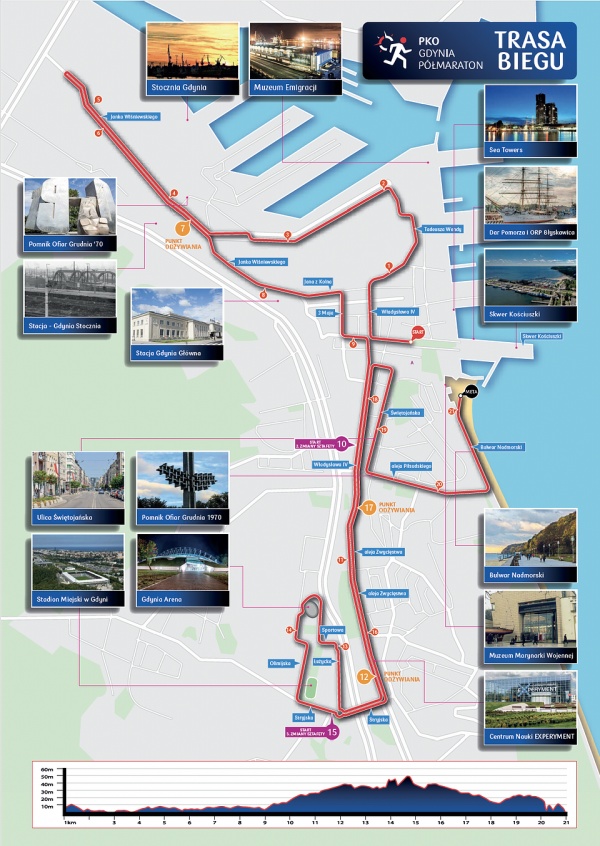 Najbardziej "sportowe" kilometry trasy prowadzą obok Polsat Plus Areny Gdynia, siedziby Gdyńskiego Centrum Sportu oraz Stadionu Miejskiego. Gdy zawodnicy skończą kluczenie ulicami Sportową, Olimpijską i Stryjską, trasa biegu poprowadzi ich Aleją Zwycięstwa. Najbardziej charakterystyczne miejsce na tym odcinku to Centrum Nauki EXPERYMENT na 16. kilometrze trasy.