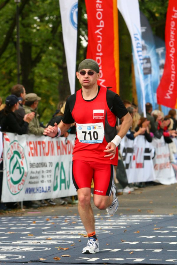 W niedzielę 13-ego września wszystko było jak trzeba, czyli super pogoda biegowa, doskonale płaska, a zarazem piękna trasa, prowadząca jednym wielkim kołem przez cały Wrocław, a i forma też nie powinna mnie zawieźć. Zakładałem, że do połowy pobiegnę z grupą na 3:30, a potem przyspieszę, jednak ten plan już na starcie się rozsypał. Ustawiłem się w tłumie dość daleko, oczywiście było ciasno, więc i grupa odjechała. Na szczęście nie zrobiło to na mnie wrażenia i ruszyłem spokojnie bez żadnego stresu. Już na pierwszym kilometrze spotkałem kolegę z TEAM-u Darka Hernika vel Ulisses, a że prezentujemy podobny poziom to biegliśmy razem, przynajmniej na początku. 10km w 50 minut, a więc bardzo dobrze, tak miało być, wcale nie szybciej, bo zawsze długo się rozkręcam i nie potrafię biec równym tempem od startu do mety. Od 10km Darek przyspieszył (taką przyjął taktykę), a ja dalej spokojnie z założeniem osiągnięcia „połówki” w 1:43-1:44. Tuż przed 14km skoczyłem na stronę, za co zostałem słownie sponiewierany przez przechodzącą mieszkankę pobliskiego bloku. No cóż, miejsce nie było zbyt fortunne na załatwienie potrzeby fizjologicznej mniejszej, ale ja po pierwsze już musiałem, a po drugie zostałem ośmielony przez innego biegacza, który chwilę wcześniej w te same krzaki się udał. No a po tej przerwie, jak się później okazało jedynej, rozpocząłem właściwe zmagania z czasem, dystansem i samym sobą też. Do połówki biegłem tempem 4:52/km i osiągnąłem ją w 1:43:55, czyli zmieściłem się w założonym czasie 1:44. Dopiero na 21-ym km dogoniłem i wyprzedziłem prowadzoną przez Wojtka Wanata grupę 3:30. Widząc tabun 60-70 biegaczy wielce byłem szczęśliwy, że jednak nie biegłem z nimi od początku. Od razu wyobraziłem sobie, co się dzieje na punktach odżywczych i jednocześnie przypomniałem sobie, ile sił niepotrzebnie traciłem na punktach w Krakowie, kiedy z taką grupą biegłem. Mój ulubiony odcinek biegu maratońskiego, czyli od połówki do 30km przeleciałem po 4:47/km i osiągając na 30km 2:26:30 pozostało mi ok. 59 minut na ostatnie 12km. Niby do zrobienia, ale jednak obaw kłębiących się w mojej głowie nie brakowało. Na szczęście pozytywnego myślenia też nie brakowało. Niespodziewanie na 30km dogoniłem i wyprzedziłem kolegę Darka, który właśnie przeżywał kryzys (ostatecznie szybko się pozbierał i osiągnął dobry wynik). Na 32km wcześniej umówiony kolega podał mi napój i batona, co mi pomogło i fizycznie i psychicznie. Do 35km jeszcze trochę podkręciłem tempo i wyszło po 4:45/km. Potem tradycyjnie pojawiły się lekkie problemy, ale głównie w głowie, tempo biegu prawie utrzymałem (od 35 do 42,195 po 4:52/km). Podstawowym czynnikiem mobilizującym było wyprzedzanie kolejnych biegaczy. Od połówki wyprzedziłem mnóstwo zawodników, a sam dałem się przegonić tylko kilku osobom. Jedną z nich był na 41km Artur Kujawiński vel Arti, który mnie dodatkowo świetnie zmotywował. Zdrowia wystarczyło jeszcze na lekkie przyspieszenie na ostatnich 300 metrach. Wpadłem na metę z czasem 3:25:14 i byłem przeszczęśliwy. Emocje puściły, kilka łez z wrażenia poleciało, byłem spełniony. Uwielbiam to uczucie na mecie maratonu, a piwo wtedy smakuje najlepiej! Dla tej ogromnej satysfakcji na mecie warto było się męczyć przez wiele tygodni, oj warto… No i najważniejsze oprócz życiówki, drugą połowę maratonu pobiegłem o dokładnie 2minuty i 36 sekund szybciej niż pierwszą! O to właśnie chodziło! To było moje tegoroczne biegowe spełnienie.