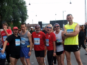 Rano Adam podwozi nas na start samochodem, pogoda zapowiada się niezła, świeci słoneczko. Start i meta jest usytuowana nad morzem na starym mieście. Na starcie staje 10700 zawodników. Ostatnie życzenia i pożegnania. Przeciskam się z Tomkiem bardziej do przodu, Gosia biegnie z Józkiem. Startujemy! Kopenhaga jest bardzo ładnym miastem, trasa prowadzi przez wszystkie ciekawe miejsca miasta, dwie duże powtarzające się pętle i jedna mała. Mnóstwo kibiców na całej trasie. Niestety, po godzinie zaczyna padać, robi się zimno. Biegnę spokojnie, równo ok. 5.30 min/km.