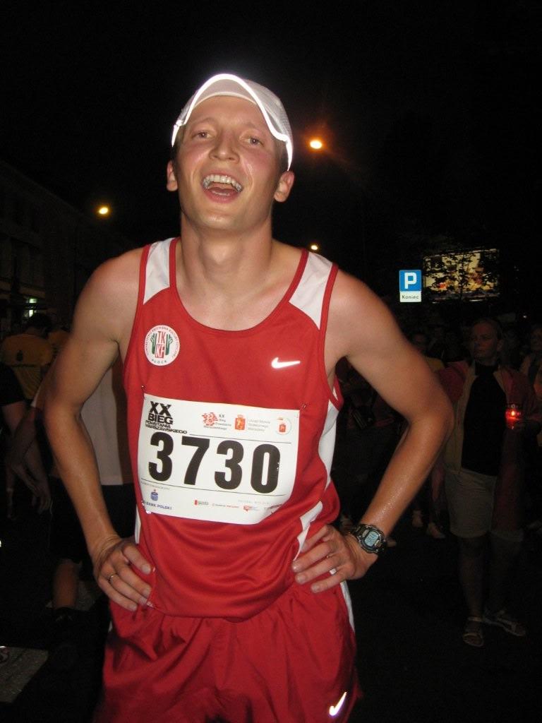 Tak wygl±daj± moje życiówki na długich dystansach. Ci, którzy mnie znaj±, wiedz±, dlaczego jestem biegaczem niespełnionym. Nieznajomym wytłumaczę to w kilku zdaniach: Biegi długie uprawiam od 1997 roku. Zaczynałem od ¶rednich dystansów, ale od pocz±tku wiedziałem, że chcę być dobrym maratończykiem. Kiedy od 2002 roku „wszedłem” na ulicę, wszystko układało się pomy¶lnie. W wieku 22 lat pobiegłem dwukrotnie półmaraton poniżej 1godz. 10 min. Na ostatnim roku studiów doszedłem do wniosku, że nadszedł czas na maratoński debiut. Został on wyznaczony na 17 wrze¶nia 2006 r. w Warszawie. Pomimo, że przygotowania przebiegały wy¶mienicie (trenowałem z Przemkiem Giżyńskim) maraton okazał się niewypałem. Na półmetku miałem 1h16’58” i super samopoczucie. Leciałem na 2h35 min. Jednak tempo to było zbyt szybkie dla mnie i na 34 km zeszedłem z trasy. Po nieudanym debiucie znalazłem pierwsz± pracę, następnie przyszł± żonę i bieganie poszło w odstawkę. W międzyczasie próbowałem zrobić karierę jako sędzia piłki nożnej, jednak po 190 meczach dałem sobie spokój. To nie dla mnie! Zafascynował mnie także triathlon. Ukończyłem 8 triathlonów, w tym 3 olimpijskie. Kiedy dowiedziałem się, że wkrótce zostanę tat±, od razu poczułem, że muszę załatwić pewn± sprawę- ukończyć maraton!!!