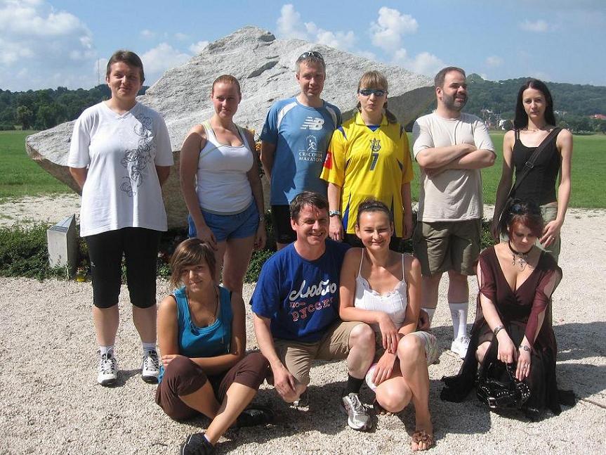 Od połowy czerwca do końca lipca 2009 biegałem kilka razy w tygodniu wył±cznie wokól krakowskich Błoń, w podobnym tempie - od dwóch do czterech okr±żeń (od 7 do 14 km). W zależno¶ci od tego, jaka była pogoda. W słońcu udało mi się niekiedy przebiec 14 km, ależ to była męczarnia - lipiec 2009 roku był bardzo gor±cy. Namówiłem nawet młodszych kolegów z pracy na tzw. Biegi Instytutowe wokół Błoń i parę razy to wyszło. Sympatyczna grupa, widoczna na zdjęciu obok, jednak się rozproszyła, a ja dreptałem sobie dalej. My¶lałem, że tak wła¶nie przygotuję się do Maratonu. Aby za¶ wzmocnić wytrzymało¶ć, starałem się - bardzo głupio! - nic nie pić podczas treningu (bo jak się tylko napiłem, to już był koniec biegania, nogi bowiem mówiły - "dosyć!")).