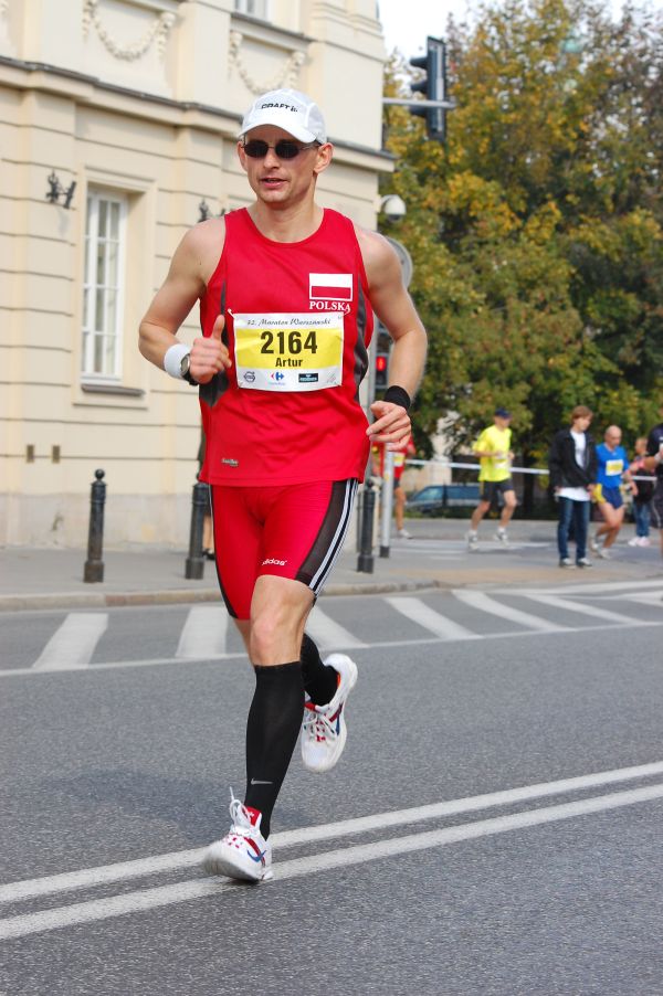 Trzymając się chronologii najpierw był sukces. W tytule napisałem, że mały, bo w półmaratonie, ale w momencie, kiedy go odniosłem, oczywiście wydawał się wielki. Teraz z perspektywy czasu już trochę zmalał. Rzeczony sukces to mój wynik w Półmaratonie Philipsa w Pile, gdzie nabiegałem życiówkę 1:30:57. Ten start to same pozytywy, pisałem z resztą o tym w osobnym wpisie. Niestety ten mały (półmaratoński) sukces nie przełożył się na duży maratoński, choć taki był mój cel tej jesieni. Paradoksalnie ten dobry wynik z Piły był po części przyczyną dużej porażki w Maratonie Warszawskim. Dlaczego? Ano dlatego, że nadzieje zostały zbytnio rozbudzone i najzwyczajniej w świecie poniosła mnie ułańska fantazja. Poza tym wykazałem się nadgorliwością w ciągu ostatnich 3 tygodni przygotowań (po starcie w Pile) i najzwyczajniej w świecie przesadziłem z obciążeniami i się przetrenowałem. A nadgorliwość podobno gorsza od faszyzmu, jak to mówią… I zamiast atakowanego 3:15 skończyło się na 3:21:32, sporym rozczarowaniu i jeszcze większym zniszczeniu fizycznym. Do 35 km szło dobrze, trzymałem się z grupą na 3:15. Jasna sprawa, że powinienem zacząć wolniej i tak też zacząłem. Jednak po 2 wolnych kilometrach (po 4:45/km) przyspieszyłem do mojego naturalnego, jak się wydawało, tempa. Zrobiło się niebezpiecznie szybko, ale gdzieś na 7 km dogoniłem w/w grupę i już się jej trzymałem. Po międzyczasach orientowałem się, że jest za szybko, wszak grupa nadrabiała do brutto. Cóż z tego, skoro emocje tak mnie niosły, że odnosiłem wrażenie, że grupa mnie spowalnia. Teoretycznie powinienem biec gdzieś ok. 1-1,5 minuty za nimi i powoli doganiać, ale teoria teorią, a życie życiem. Po pierwsze nie chciałem biec samotnie, a przed i za grupą była pustka, a po drugie obawiałem się, że przy takim tempie po 30 km nie będę w stanie przyspieszać, a jedynie pozostanie walka o utrzymanie tempa lub nieznaczne straty. A do tego wszystkiego te emocje i prowokująco dobre warunki pogodowe. To się nie mogło dobrze skończyć! No i nie skończyło! Na 35 km grupa mi lekko odjechała, choć wciąż biegłem na ok. 3:16-3:17. Niestety od 36 km pojawiły się skurcze, które spowodowały 5 przymusowych postojów i tracenie ok. minuty na każdym kilometrze. Jeszcze na 40 km byłem na złamanie 3:20, czyli minimalnie poprawioną życiówkę. Gdybym tylko mógł biec do końca! Głowa chciała, płuca też, a mięśnie dwugłowe powiedziały stop i to jeszcze 2 razy na ostatnich 2 km. No cóż, na mecie zachwycony nie byłem, pomimo osiągnięcia drugiego w życiu wyniku maratońskiego. A miało być tak pięknie! Pewnie w innych okolicznościach uznałbym ten wynik za bardzo dobry, ale nie tym razem. Styl ostatnich kilometrów był fatalny, byłem za słaby mięśniowo i jest to zdecydowanie do poprawki. Wnioski z tej niewątpliwie dużej porażki wyciągnąłem dosyć szybko, błędy namierzyłem i nie pozostaje nic innego, jak lepiej się przygotować i ponowić w przyszłym sezonie atak na 3:15, tym razem skutecznie, mam nadzieję. Nie ma to jak niedosyt i sportowa złość…