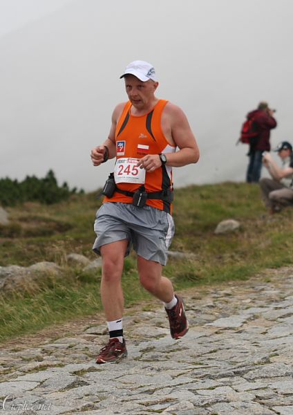 Dodatkowo przelotne opady deszczu osłabiały przyczepność na kamiennych szlakach, co szczególnie dało się odczuć w okolicach Śnieżnych Kotłów. Pogoda jednak była wyjątkowo łaskawa - ciepło, lecz bez upału z lekkim zachmurzeniem i przelotnym deszczem - wymarzona pogoda na górski maraton. Na długo zapamiętam ten bieg, szczególnie chwilę gdy na mniej więcej 33 kilometrze znalazłem się sam na szlaku, otoczony mgłą i kosodrzewiną, nie widząc biegacza przede mną ani za mną. Zwątpiłem - czy czasem nie zbłądziłem? Po chwili wyłoniła się z mgły grupa skał a obok niej oznaczenie szlaku - ufff, ulga, jestem "na ścieżce". Jest dobrze.