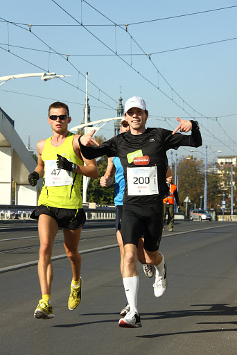 20 minut przed startem wyszedłem z domu, po drodze robiąc krótką rozgrzewkę (zdecydowanie zbyt krótką, co odczułem na pierwszych kilometrach). Na start dotarłem na kilka minut przed wystrzałem startera, więc nie było już czasu z nikim pogadać, ustawiłem się w elicie i czekałem... 3... 2... 1... I ruszyli... Po kilkudziesięciu metrach byłem już obok Patryka (wcześniej był zbyt duży ścisk, żeby się przedzierać) i rozpoczęliśmy wspólną walkę. Pierwsze kilometry były jak już pisałem dość ciężkie, później jednak im dalej tym biegło mi się lepiej... Kiedy starałem się przypomnieć sobie jak czułem się w Paryżu to przekonany byłem że wtedy biegło mi się gorzej... Ok. 10 kilometra po raz pierwszy przyszedł mi do głowy, żeby pobiec cały dystans... Ogromna ilość znajomych na trasie bardzo mobilizowała do biegu... Najgorsza była prosta na Baraniaka między 20, a 22 kilometrem - podbieg i bieg pod wiatr. Myślałem, że to już mój koniec - ale wtedy okazało się że Patryk czuje się podobnie, trzeba było więc to po prostu przetrwać. Za zakrętem czekała nas ulga... Wystarczyło trochę wyluzować i dobre samopoczucie momentalnie wróciło, pojawił się jednak inny problem - ból stóp :( Na bieg ubrałem lekkie Pumy FAAS 300... Biega mi się w nich świetnie, ale nigdy nie biegłem w nich tak długo... Kolejne kroki sprawiały mi taki ból, że wiedziałem że to już koniec mojej zabawy z maratonem. Ostatecznie poddałem się na 23 kilometrze, czując się świetnie... Podeszwy stóp miałem jednak tak obolałe (i nadal mam), że jedyne co mogłem robić to spacerować...