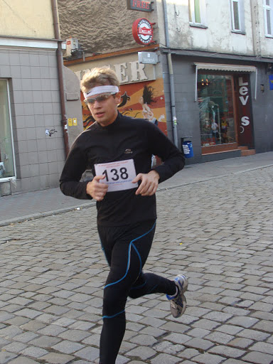 A teraz coś z trasy. Ciekawa, szybka pomijając podbieg, na którym niewątpliwie trzeba było zwolnić, choć znowu do najtrudniejszych i najdłuższych nie należał. Nie miałem z nim specjalnych trudności, tzn. równym tempem sobie wbiegłem i nie miałem żadnego dołka przed czy w trakcie. Gdyby był dłuższy - to już inna gadka :) Ciekawe zakręty i możliwość dosięgnięcia wzrokiem kolejnego zakrętu nie pozwalała na stagnację i bieg typu "Ja... Ile jeszcze tej prostej". Choć na początku przez taką ciasnotę i ilość uczestników kilka razy dostałem łokciami, a żeby się przebić wybrałem chodnik. Trochę małe zainteresowanie biegiem. W uliczkach tylko kilku przechodniów dopingujących, mało klaskania i pokrzykiwania.