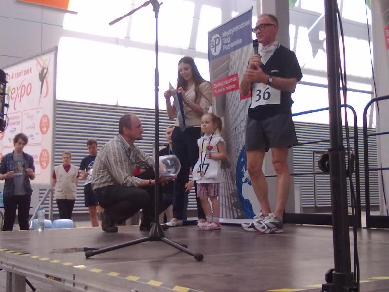 Był medal zawieszony na szyi, gratulację od starszych biegaczy jak i specjalne od dziewczynek także biegnących w biegu, które długo gratulowały odwagi, oczywiście było też losowanie nagród i nikt inny jak Lenka nie mógł sam dla siebie wylosować nagrody - mała szczęściara - dostała nawet od jednego z wystawców na targach - specjalną biegową koszulkę, jednak nawet do rozmiaru XS - mała pięciolatka musi jeszcze urosnąć :)