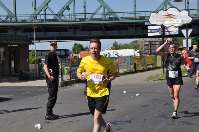 Zajęty przygotowaniami do ostródzkiego półmaratonu kompletnie ominęła mnie informacja o przełożeniu zawodów w Toruniu na 20 go maja. Dzień po starcie w Ostródzie szukając wyników odkryłem ku mojemu zdziwieniu możliwość startu w tym pięknym mieście. Natychmiast chwyciłem kalendarz i sprawdziłem terminy imprez do zagrania. Przypadek a może właśnie dobry znak bo niedziela była wolna. Mało tego sobotni wieczór zajęty ale jest możliwość zastępstwa. Oznajmiam żonie i mówię o wizji wspólnego spacerowania po uliczkach Torunia. Odpowiada - czyś ty zwariował? Zgłupiałeś do reszty! Mogę jechać ale jeśli nie będziesz biegł. Jedyny argument jaki przychodzi mi do głowy to fakt, że do września nie będę miał czasu aby wystartować - zatem go wykorzystuję. A teraz może masz czas? Człowieku zobacz w kalendarz. Poniedziałek impreza, rano we wtorek na 7 do pracy, we środę impreza a w czwartek rano od razu z imprezy jedziesz na szkolenie do Stargardu szczecińskiego jak wrócisz w piątek idziesz grać a rano w sobotę na 8 do pracy. W sobotę po robocie też grasz. Nazywasz to sprzyjającymi okolicznościami? Rozpaczliwie szukam czegoś na obronę. Odpieram zatem: owszem jadę na szkolenie ale samochód prowadzi kolega a nie ja - to może się zdrzemnę. W piątek rano pośpię aż do 10 tej to dłużej niż zwykle o kilka godzin. Dorzucam, że piątek jakoś przetrwam a w sobotę między 13 a 19stą się zdrzemnę- to odeśpię, a w sobotni wieczór zagram do północy a resztę zagra szwagier. No i jeśli będę się źle czuł to po prostu tylko pokibicuję Sławkowi, którego wcześniej namówiłem na start. W końcu jakimś cudem przekonałem żonę na kilka dni przed startem do mojego pomysłu i z potwornym deficytem snu znowu stoję na linii startu zadając sobie pytanie : co ja tu robię. Tym razem stanąłem praktycznie na końcu stawki. Odpowiednio ubrany w oddychającą koszulkę i krótkie spodenki trzymam butelkę izotoniku bo już jest upalnie a ma być około 30 stopni. Moje słynne już na całą Ostródzką Grupę Biegową grube dresy grzecznie czekają na zimę. Mam także dwa żele jeden z pakietu a jeden od kuzyna .Jestem pewny, że wyeliminowałem błędy z Ostródy. Ponownie odczuwam niemal euforię z uczestnictwa w tym biegu. Równocześnie obok radości po raz pierwszy towarzyszy mi strach. Strach o samego siebie. Po takiej dawce iście wycieńczającej pracy zamiast spać kilkanaście godzin mam zamiar pobiegać sobie ponad dwadzieścia kilometrów. Gdzieś głęboko rozsądek poszeptuje, że to ryzykowne. Świadomość startu w tym biegu razem z maratończykami kusi ogromnie i szala przechyla się na korzyść szaleństwa - decyduję się biec. Ten start poprzedził ogromny wysiłek na treningach. Tydzień przed samym startem samotnie pobiegłem całą trasę naszego ostródzkiego półmaratonu Św. Jerzego. W debiucie ku mojej rozpaczy miałem 2:09:33 a tydzień temu znacznie poprawiłem ten rezultat. Chciałem wiedzieć na ile mnie stać tak naprawdę. Rezultat tego treningu rozpalił nadzieje na Toruń i moja determinacja na start sięga desperacji. Odliczanie i lecimy. Bardzo delikatnie, nie za wolno ale bez wysiłku. Odmienny stan świadomości z powodu niewyspania, brukowane uliczki starego miasta, wyczuwalna wielowiekowa tradycja tego miejsca jeszcze bardziej dodaje irracjonalności togo co robię. Wpadam we właściwy rytm. Doskonale to wiem. Całe ciało daje znaki o dobrym samopoczuciu. Mam wrażenie, że znika zamulenie z przed startu. Nawet myśli mi się łatwiej. Biegnę i dzięki uprzejmości wielu biegaczy w każdej chwili mówią mi jakie mamy tempo. W przeciwieństwie do biegu w Ostródzie wszyscy operują właśnie czasem na kilometr, którym lubię się posługiwać. Biegnę tak jak założyłem. Przez pierwszy kwadrans wolniej od założonego tempa o kilka sekund na km. Po wejściu organizmu w bieg postanawiam minimalnie przyspieszyć. Doganiam grupkę, która imponuje mi swoim spokojem. Zamieniamy kilka słów i przez długi czas wyprzedamy się nawzajem co kilka kilometrów. Przez ten czas mijam bardzo wielu biegaczy czego nie doświadczyłem jeszcze nigdy. Mam świadomość, że nie jest to do końca moją zasługą. Po pierwsze biegnę razem z maratończykami, którzy spokojnie rozkładają siły na bardzo długie kilometry. Po drugie na starcie byłem na samym końcu. Po trzecie jest strasznie gorąco i wielu zawodników się ukisiło ale o dziwo ja czuję się rześko i naprawdę dobrze. Zastanawiam się, kiedy zacząć spożywać żele. „Piję zanim przypomni mi o tym pragnienie” to może postąpię tak samo z żelami i przed nawrotem na półmetku otwieram pierwszy pamiętając aby popijać. Nie znam reakcji na żel w czasie biegu bo pierwszy raz jadłem żel dwie godziny po półmaratonie w Ostródzie ale mam przeświadczenie, że nic mi nie zaszkodzi. Wszystko dziś miało być przeciwko mnie a tu naprawdę idzie z górki. Wszystko składa się na moją korzyść. Rozmawiam ponownie z dwójką chłopaków . Zapewniają mnie, że nie przeszkadza im moje dopytywanie o tempo. Dowiaduję się, że robią dziś maraton. Wyglądają na niezmęczonych i równiutko biegniemy do przodu. Podane przez nich tempo pasuje mi z prognozami podają mi chwilowe i średnie wskazania. Pytają nawet co biegnę i dowiedziawszy się podpowiadają żeby śmiało lecieć do przodu. Odpowiadam im że na takim dystansie podane przez nich tempo to moje maksimum. Wiem i czuję, że biegnę w tej chwili na 100% moich możliwości. Nieprawdopodobnie miłe doświadczenie. Mijam kolejne kilometry i zbliżam się do końca dużej pętli i jestem ponownie na starówce Torunia. Szukam moich najbliższych. Pierwszą dostrzegam żonę potem córeczkę. Dopingują mi bardzo mocno. Przy odgradzających płotkach widzę Igora –mojego siostrzeńca , który krzyczy: wujek, chcesz się napić? Tak, tak odpowiadam. Biegnie ze mną j