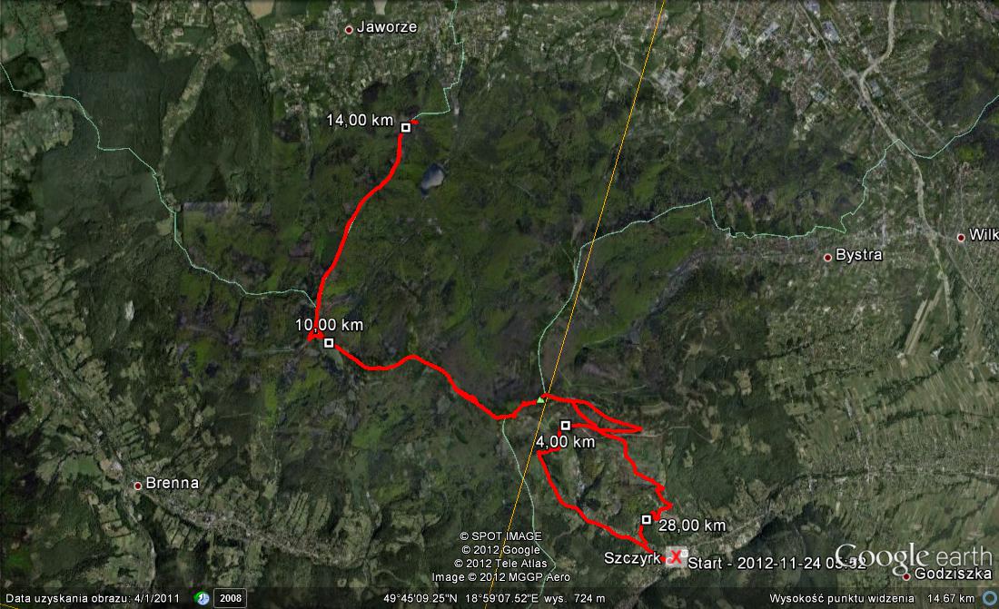 W Szczyrku meldujemy się o 5:40. Droga pusta ale śliska. W końcu mamy koniec listopada. Parkujemy pod domem towarowym w Centrum Szczyrku. Hmmm "Centrum" tego uroczego miejsca to chyba nie zbyt odpowiednie słowo ale niech już tak zostanie. Parkujemy w "Centrum" i koniec. Po drodze upewniamy się, czy mamy czołówki. W końcu mamy jeszcze parę chwil aż słońce nas przywita. Czołówki są. Jest dobrze. Plan na dzisiaj 25 km w tempie ok 8 - 9 minut na km.