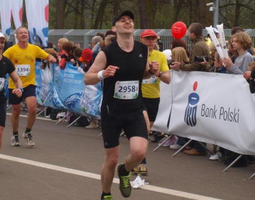Nie wiem jak to się stało, ale na 300m przed metą dostałem jakiejś dziwnej energii! Przyspieszyłem jeszcze bardziej, widziałem tylko metę i czas brutto! Wiedziałem już, że będzie poniżej 4h (nawet brutto)! Byłem szczęśliwy!!! Wpadłem na metę z uniesionymi rękoma!!! Uczucie nie do opisania (pewnie nie jestem oryginalny)!!!