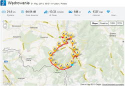 W pi±tek 31-05-2013 zawiozłem auto do mechanika w Ustroniu. Zabrałem ze sob± naszego psa - Frytkę - sze¶cioletni± beagielkę. Powiedziano nam, żeby wrócić jak najpóĽniej. Nasz± wędrówkę potraktowali¶my jako jeden z treningów. Z warsztatu wyruszyli¶my do centrum Ustronia, do stacji PKP przeszli¶my 2 km. Tam zaczęło padać. Ubrałem kurtkę i nie zważaj±c na niesprzyjaj±c± pogodę pomaszerowali¶my dalej. Wzdłuż rzeki Wisły dotarli¶my do czerwonego szlaku turystycznego na wysoko¶ci dolnej polany pod Czantori±. Tam pogoda się poprawiła i mogłem pozbyć się kurtki. Szlakiem czerwonym wdrapali¶my się najpierw do górnej stacji wyci±gu krzesełkowego na Czantorię Wielk±. Tam zrobiłem chwilkę przerwy. Frytka wy[piła miskę wody, a ja zjadłem bułkę z jogurtem. Przebrałem zupełnie mokr± koszulkę i ruszyli¶my w kierunku szczytu. Na górze była cała masa turystów. My jednak nie robili¶my przerwy i poszli¶my dalej, szlakiem czarnym, w kierunku Małej Czantorii. Podej¶cie pod sam szczyt Małej Czantorii to jedno z najładniejszych miejsc w Beskidzie ¦l±skim. Rozkoszowali¶my się przepięknymi widokami st±paj±c po ¶wieżej zielonej trawce. Dalej żółtym szlakiem zeszli¶my do centrum Ustronia. Stamt±d poszli¶my do warsztatu zobaczyć czy auto jest już gotowe. Rozładował mi się telefon i nie mogłem zadzwonić. Niestety auto nie było jeszcze gotowe i mieli¶my do zagospodarowania kolejne dwie godziny. Poszli¶my więc nad Wisłę i tam chwilkę odsapnęli¶my. Powrót był męcz±cy ale w końcu doczłapali¶my się do mechanika i odebrali¶my naprawione auto.