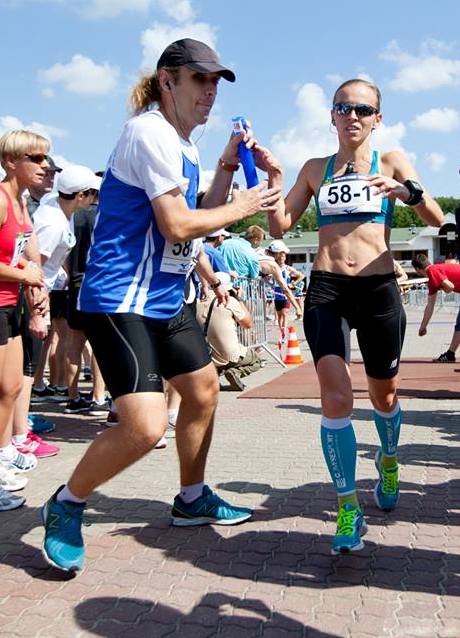 Pogoda była taka… że jak bym się rozebrała jak tego potrzebowałam nr startowy musiałabym nieść w zębach… upał, duchota, i słońce – to coś lubię na plaży trzymając w ręku zimne piwo a nie na zawodach :) … ale pogody na zawody się nie wybiera… nie ma złej pogody… są tylko słabe charaktery … więc go! Po mnie startował Tomek … ćwiczyliśmy wcześniej przy źródełku przekazywania sobie sztafety… szkoda czasu… ostatecznie stwierdziłam, że ją po prostu doniosę do strefy zmian a on ma tam czekać aż mu włożę…