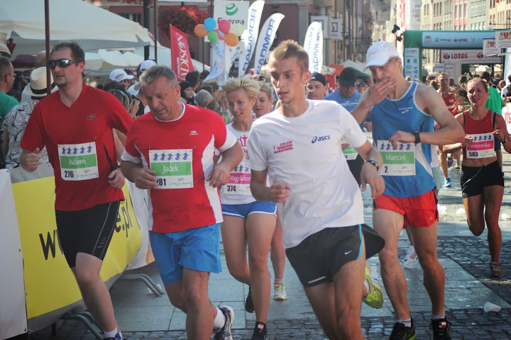 Wyjechaliśmy spokojnie o 12 by pospacerować po Długiej. Jednak znalezienie miejsca parkingowego zajęło nam trochę czasu, a po przyjściu na miejsce imprezy musieliśmy odebrać pakiety startowe. Tzn. musieli to zrobić moi koledzy, bo ja biegłem PK (poza konkurencja), gdyż MIAŁEM prowadzić kolegę Dawida. Dlaczego podkreśliłem słowo "miałem" ? Zaraz do tego przejdę, ale najpierw trzeba trochę zjechać organizatorów. Najgorzej było ze szatniami. Zwykły pawilon ogrodowy z (uwaga) przezroczystymi ściankami. Obok przechodzą ludzie, przechodnie, którzy raczej nie chcą patrzeć na przebierających się ludzi. U mężczyzn to pół biedy, a co miały powiedzieć kobiety? Taka sama sprawa. Namiot o wymiarach bodajże 10x5m. Oczywiście każdy bez problemu mógł zobaczyć jak kobiety się przebierały. Na dodatek w tej "szatni" był jeden stół i dwie ławki do niego dostawione, który pewnie miały pomóc wszystkim biegaczom przy przebieraniu się.