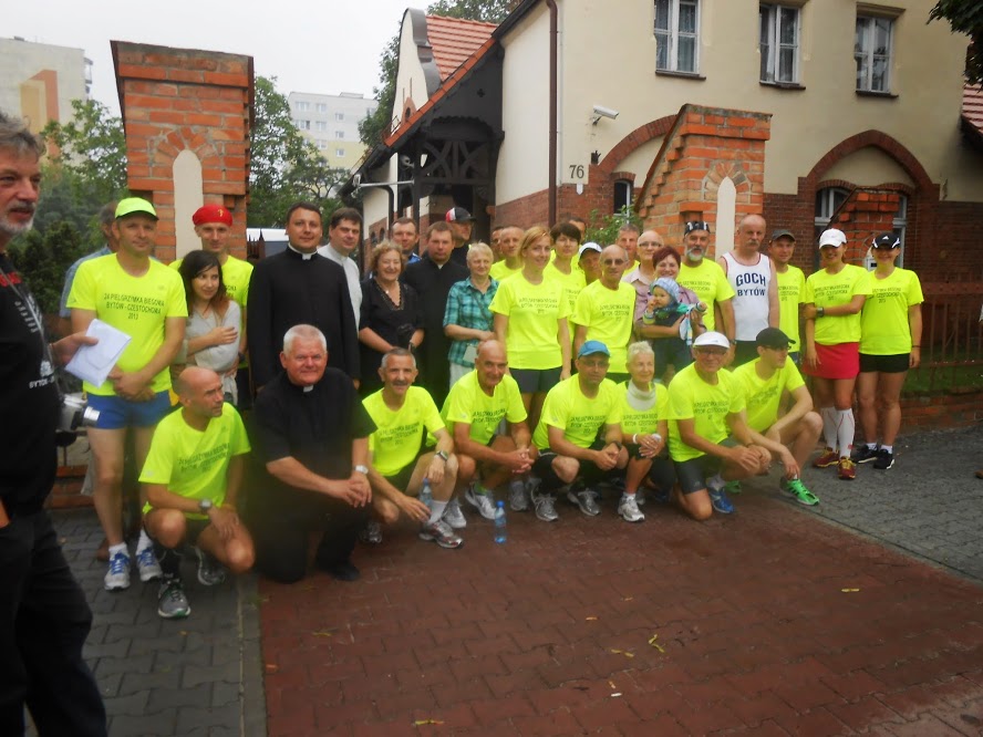 Grzmoty, błyskawice, wiatr jak w Kielcach na dworcu i woda lejąca się z nieba – te oto atrakcje zafundował nam Najwyższy w toruńską noc. Nie dało się spać. Było tylko rzucanie się z lewego boku na prawy i odwrotnie. Podobno to Wisła uwięziła paskudną burzę i nie chciała jej wypuścić z uścisku. A rano trzeba wstać i szykować się do kolejnego, czwartego już etapu. Na szczęście jest najkrótszy, niespełna 8o kilometrów do przebiegnięcia. Meta będzie w Krośniewicach. Po dobrym śniadanku w miłym towarzystwie ruszyliśmy z Jarkiem na miejsce zbiórki. Na szczęście przestało padać. Po porannej Mszy św., podczas której co drugi „medytował” kazanie ks. Krzysztofa z zamkniętymi oczami dziwnie potakując, ostatnich pożegnaniach, pysznej proboszczowskiej kawusi (tego mi było trzeba) i pamiątkowej fotce, ruszyliśmy na trasę. Biegliśmy niemal przez cały Toruń, eskortowani przez „misiaczków na hulajnogach”, jakby to Mirek podał przez radio. Przebiegliśmy żelazny most i ruszyliśmy dalej. Zawsze ciekawiło mnie, co też sobie myślą kierowcy, kiedy mijają tak grupę? Niby miało być krótko, co nie znaczy, ze nudno. Dzisiaj w planach były odwiedziny dwóch tragicznych miejsc. Najpierw, zaraz za Toruniem, zatrzymaliśmy się w miejscu największej po II wojnie światowej, katastrofy kolejowej. 19 sierpnia 1980 roku o 4:30 doszło do czołowego zderzenia pociągu osobowego relacji Toruń Główny – Łódź Kaliska z pociągiem towarowym relacji Otłoczyn – Wrocki, na odstępie Otłoczyn – Brzoza Toruńska. W wyniku wypadku zginęło 65 osób, dwie kolejne zmarły w szpitalu. Zawsze, od dwudziestu czterech lat, nasza pielgrzymka zatrzymuje się w tym miejscu, żeby pomodlić się za ofiary tej katastrofy i wszystkich, którzy zginęli podróżując. Gdyby nie Pielgrzymka, nic nie wiedziałbym to tym zdarzeniu. Drugie miejsce, które obowiązkowo odwiedzamy, to tama we Włocławku, miejsce męczeńskiej śmierci bł. ks. Jerzego Popiełuszki. Dla przypomnienia, to w tym miejscu wyłowiono z wody ciało ks. Jerzego, zamordowanego przez oficerów służby bezpieczeństwa 19 października 1984 roku. W tym roku czekało nas jednak małe rozczarowanie – remont miejsca, gdzie zwykle oddaje się cześć ks. Jerzemu. Popatrzyliśmy sobie z zapory, chwilę podumaliśmy i ruszyliśmy dalej. Było krócej, ale równie wesoło jak zawsze. Asia usłyszała głos swojej kochanej Babci, która nawet pochwaliła się, że „jej Asia to maratony biega”. To ks. Krzysztof zrobił prezent i zadzwonił do czcigodnej, a potem rozmowę puścił na głośnik. Charakterystycznym podkrośniewickim obrazkiem, były stragany z czosnkiem, papryczką, ogórkami itp. jak co roku, Pięknie wyglądały te zwisające kolorowe warkocze. W końcu dotarliśmy do Krośniewic. A w Krośniewicach zaczął się bój… o pątników. Każdy chciał mieć jakiegoś. Po Mszy św. udaliśmy się na nocleg. Tym razem gościliśmy się w … krośniewickiej szkole, gdzie bardzo miłego przyjęcia doznaliśmy od dwóch pań dyrektor. Porozmawialiśmy o biegowych arkanach, o problemach Krośniewic, o polskiej edukacji itd. itp. W tak miłym towarzystwie czas szybciej zleciał. Organizm w końcu upomniał się o swoje. Spać! Jutro Pabianice… (cdn)