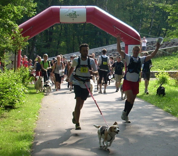 Jak co roku po maju przyszedł czerwiec. Niestety pogoda była jesienna, a my wybieraliśmy się początkiem miesiąca na wczasy. Na szczęście tym razem zabraliśmy ze sobą moich rodziców, którzy podobno zawsze mają pogodę i tym razem było podobnie. O Frytce goszczącej na kamiennych plażach Chorwacji opowiem jednak w innym poście. Po 10 dniach wypoczynku wróciliśmy do domu. Moja kuzynka Lucyna wraz ze swoją rodzinką wróciła kilka dni wcześniej z prawie rocznej podróży dookoła świata. W niedzielę zorganizowali powitanie na Równicy w Ustroniu. Zaplanowałem sobie bieg ze szczytu w stronę Cieszyna. Tak też zrobiłem. Niestety długi i stromy zbieg asfaltem dał mi się bardzo we znaki. Przez następne kilka dni cierpiałem niemiłosiernie. Łydki bolały mnie tak bardzo, że nie mogłem chodzić po schodach. Było to o tyle dziwne, że od ponad pół roku biegam regularnie trzy razy w tygodniu i nigdy nie odczuwam tego typu dolegliwości, przynajmniej przez tak długi czas. Co jeszcze dziwniejsze po zbiegu z Równicy powinny boleć mnie uda, a nie łydki. Najgorsze w tym wszystkim było to, że za tydzień miał się odbyć Zlot Dogtrekkingowy w Katowicach, a ja zacząłem mieć obawy czy moje łydki zdołają się zregenerować do soboty. Na spotkanie dogtrekkingowe tym razem wybrałem się z moim kuzynem Jankiem, który jest zapalonym biegaczem od ponad dziesięciu lat. Sonia niestety musiała iść do pracy i tym razem nie mogliśmy razem wystartować. W poniedziałek zadzwoniłem do Janka, żeby mu powiedzieć, że jestem w kiepskim stanie. Z nim nie było wiele lepiej. Właśnie odebrał trzy dniowe L4 – był przeziębiony. Zaczęliśmy się zastanawiać czy w ogóle się zapisywać. Stwierdziłem jednak, że to przecież nie będą mistrzostwa świata, czy igrzyska olimpijskie i nie musimy być w najlepszej formie, ważne, żeby spotkać się z uczestnikami i trochę się przespacerować. Zapisałem nas na zawody. Janek cierpliwie się kurował, a ja niestety nie zauważałem jakiejkolwiek poprawy. Łydki bolały niemiłosiernie. W piątek umówiliśmy się, że Janek razem z moim tatą przyjadą po mnie wcześnie rano i razem z Frytką wyruszymy do Katowic. Na miejsce dotarliśmy bez problemu. Na parkingu przy basenie było już kilka samochodów, a w pobliskim parku kręcili się już zapaleńcy ze sowimi pupilami. Zaskoczył nas fakt, że w takiej bliskości centrum Katowic, jest tak ładny i dobrze utrzymany park. Całą czwórką poszliśmy do amfiteatru gdzie organizatorzy ulokowali biuro zawodów oraz miejsce startu i mety. Przeszliśmy krótką weryfikację danych i otrzymaliśmy pakiet startowy – numer startowy 21, saszetka karmy Fitmin, talony na jedzenie i broszurę od producenta karmy. Wróciliśmy do auta, żeby się przebrać i przygotować do startu. Po kilkunastu minutach wróciliśmy na miejsce startu. Spotkaliśmy tam naszych znajomych Karolinę, Krzyśka z Lusią, Jarka z Tissotem oraz Olę z Aresem i Ozzym. Wszyscy pytali o Sonię. Janek zaczął rozgrzewkę, a Karolina powiedziała, że przywiozłem profesjonalistę. Ja w duchu pomyślałem, że faktycznie, tym razem ja na pewno będę poganiamy przez kuzyna. Powiedzieliśmy, że traktujemy tę rywalizację poważnie i postaramy się dać z siebie wszystko. Pogoda tego dnia była przepiękna. Świeciło słońce i zapowiadał się bardzo ładny dzień, może nawet zbyt ładny. Pieski na pewno będą miały ciężko, szczególnie te z długą sierścią. Organizatorzy rozdali mapy i Paweł zaczął objaśniać szczegóły trasy. Tata jak zwykle zanotował nam najważniejsze informacje i byliśmy gotowi do startu. Na kilkanaście sekund przed startem przeszliśmy na sam przód, żeby od uniknąć stresu dla Frytki. Jak jest z przodu przed wszystkimi to nie myśli o wszczynaniu niepotrzebnych kłótni z pozostałymi pieskami. Krótkie odliczanie, trzy, dwa, jeden i wystrzeliliśmy jak z procy. Po kilkuset metrach mieliśmy dość sporą przewagę nad główną grupą, za nami podążał jedynie Jarek z Tissotem. Na początku biegliśmy leśną ścieżką gdzie organizatorzy porozwieszali strzałki kierujące nas we właściwym kierunku. Do pierwszego punktu kontrolnego zdążyliśmy się zgubić po raz pierwszy. Po trzystu metrach stwierdziliśmy wspólnie z Jarkiem, że musimy się trochę wrócić. Biegiem dopadliśmy pierwszego punktu kontrolnego. Janek zapisał hasło „Familok” odbił perforator i pobiegliśmy dalej. Biegliśmy leśną drogą, a przed nami pojawiło się dwoje uczestników. Jeden z nich skręcił w lewo, a dziewczyna się zastanawiała. Zrobiliśmy małą burzę mózgów i zgodnie stwierdziliśmy, że musimy poruszać się dalej prosto. Dopiero za rzeczką skręcimy w lewo. Całą czwórką truchtaliśmy przed siebie. Po kilku minutach pojawiła się rzeczka i za nią droga w lewo. Skręciliśmy w nią i troszkę przyspieszyliśmy. Do punktu drugiego dobiegliśmy już sami. Nasi towarzysze chyba zwolnili i zostali w tyle. Hasło brzmiało „Oberiba”. Dalej biegliśmy stałym i równym tempem. Przekroczyliśmy drogę i dalej biegliśmy czarnym szlakiem rowerowym. Szlak prowadził na początku lasem, a później brzegiem lasu i brzegiem malowniczo położonego osiedla domków jednorodzinnych. Bez problemu zlokalizowaliśmy punkt numer trzy, hasło brzmiało „Maszkety”. Tam też mieliśmy pierwszy kontakt z całą chmarą komarów, które chciały sobie na nas urządzić prawdziwą ucztę. Daliśmy Frytce wody i szybko uciekając przed tymi małymi krwiopijcami ruszyliśmy w dalszą drogę. Minęliśmy boisko piłkarskie usytuowane w lesie, dalej przebiegliśmy nad rzeką i minęliśmy zagłębie stadnin z przepięknymi końmi. Punkt czwarty trochę minęliśmy, Janek wrócił się kilkanaście metrów i odpisał hasło „Gizol”. Tutaj popełniliśmy największy błąd tego dnia. Zamiast pobiec dalej prostą drogą, którą prowadził czarny szlak rowerowy