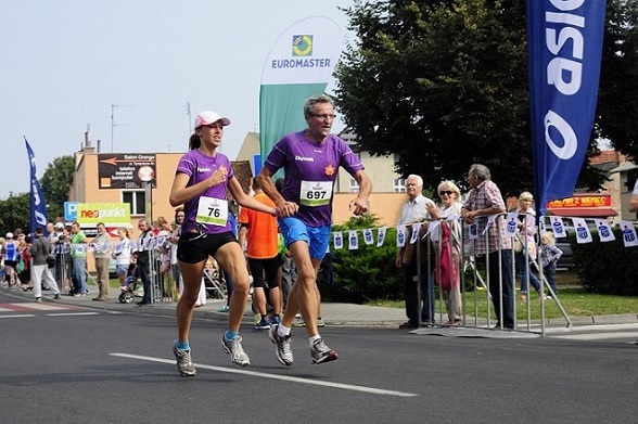 Brzuch dokuczał mi od początku. Od roku zmagam się z niezidentyfikowanym bólem pojawiającym się na każdym biegu, czy to trening czy zawody, pod żebrem. To nie kolka ani żołądek, tak naprawdę nie wiem co. Gdy zaczyna boleć na maxa, już nic nie można zrobić poza zatrzymaniem się, skłonem i dalszym świńskim truchtem, bo ilekroć staram się przyspieszyć, jest jeszcze gorzej... Mimo wszystko motywowałam się muzyką, która poprzez słuchawkę płynęła do mojego ucha, krzycząc "when the body say "stop", the spirit cries "never"!". Dusza więc pragnęła, aby tabliczki z kolejnymi kilometrami pojawiały się jak najszybciej i nawet się udawało. Niestety na 3 kilometry przed metą, ból mojego brzucha osiągnął apogeum i nie dawał spokoju za żadne skarby. Nie pomogły uciskania, zmiana oddechu, rytmu biegu... Wbiegając już w ulice Nowego Tomyśla, znajomy z Wolsztyna krzyknął "Honda, uciekaj, tata cię goni!", pomyślałam wtedy: nieeee, wcale nie będę uciekać, a wręcz przeciwnie, razem z nim pokonam ostatnie kilometry tego biegu! Tata od maja zmaga się z kontuzją pachwiny, w Chyżej postanowił jednak wystartować treningowo. (Aż wstyd się przyznać, ale tata z kontuzją biegał ostatnio o wiele więcej niż ja bez niej!). Tata dołączył do mnie i od razu zrobiło mi się lepiej, choć ból nie ustawał. Na ostatniej prostej, wbiegając na metę i będąc oklaskiwani przez kibiców, chwyciliśmy się za ręce i unieśliśmy je w górę w geście zwycięstwa - tata nad kontuzją, ja nad brakiem treningów.