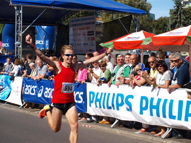 Kilka razy budziłem się w nocy, ale to z nadmiaru emocji, a nie hałasu i wreszcie przed siódmą wygrzebałem się z łózka. Dzień zacząłem od krótkiej gimnastyki przed motelem w rześkim jeszcze powietrzu, po czym wróciłem na 2 bułki z miodem, które tradycyjnie zapiłem kawą. Czas do wyjścia na bieg tradycyjnie dłużył się w nieskończoność i wreszcie 10.20 wybiegliśmy w stronę startu. Patelnia robiła się konkretna, było coraz cieplej i na domiar złego wiatr momentami był znaczący. Udało nam się wcisnąć 2metry za linię startu i punktualnie o 11 ruszyliśmy przed siebie. Temperatura w cieniu wzrosła do 25stC. Zakładałem przed biegiem, że tempo 3:36 powinno udać mi się utrzymać, co pozwoli na wynik 1:15:50-1:16:00. Uzgodniliśmy z trenerem minimalnie wolniejszy początek, jednak chyba ani on, ani ja niespecjalnie wierzyliśmy w szansę na zrealizowanie tych założeń. Otwarcie wyszło w 3:31 i dopiero później minimalnie zwolniłem. Czas na piątce 17:54 (6s zapasu), biegło się bardzo komfortowo. Na każdym z trzech punktów odżywczych brałem po 2małe łyki wody i resztę kubka wylewałem na głowę. Pobiegłem bez czapki, za to w okularach oraz pierwszy raz od dawna bez skarpet kompresyjnych na zawodach. Na dyszce zameldowałem się z czasem 35:47 (13s zapasu), a komfort biegu był jakby jeszcze większy. Już wtedy wiedziałem, że to jest mój dzień. Nie umiałem jednak znaleźć się w żadnej grupce, co chwila przeskakiwałem do przodu. Co wypatrzyłem kolejną ofiarę na horyzoncie, to zrównując się z nią i zwalniając do jej tempa, wydawało mi się ono za wolne i wypatrywałem kolejnego punktu przed sobą. Także z wiatrem przyszło mi walczyć głównie w samotności, słońce nieoczekiwanie nie wywierało na mnie żadnego wrażenia. To pewnie w jakiejś tam mierze zasługa wczasów na upalnej Korsyce. Piętnasty kilometr minąłem po 53:39 (21s zapasu), mięśniowo i oddechowo cały czas było bardzo komfortowo. Wreszcie koło 16km dojrzałem silną grupę 4 biegaczy, którą doszedłem po 2km. I trochę żałuję że nie ruszyłem od razu mocniej z Tomaszem Wiatrem z KB Maniac Poznań. Dopiero na 19km dotarło do mnie że jest szansa na połamanie 75minut. Sprężyłem poślady i szarpnąłem bardziej zdecydowanie. Ostatnie 1,1km poleciałem w tempie 3:15, przy czym to nie był specjalnie mocny finisz, wciąż czułem rezerwy, a bojąc się głupiego naderwania mięśni bałem się włączyć turbo. Dobiegłem więc nieco zachowawczo, tak by rozprawić się z barierą pełnej minuty na mecie. Zegarek zatrzymałem po 1:14:56 (śr tempo 3:33/km), co jest oczywiście nowym rekordem życiowym poprawionym aż o 2min40s. Dało mi to 23. miejsce Open (na blisko 2,5tys startujących), za 4 Kenijczykami i 2 Białorusinami. Warto nadmienić, że w ramach pilskiego półmaratonu były rozgrywane Mistrzostwa Polski, w których zwyciężył Marcin Błaziński, przed Pawłem Ochalem i Emilem Dobrowolskim. Oczywiście nie wszyscy startujący Polacy uczestniczą w Mistrzostwach, trzeba w tym celu posiadać licencję zawodniczą. Będąc 17. Polakiem na mecie, dałem się wyprzedzić tylko dziesiątce uczestników MP. Kolega Andrzej również poprawił swój najlepszy wynik i z czasem 1:17:52 zajął 32. miejsce.