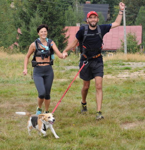 Od ostatniego spotkania z dogtrekkingowcami minął już ogromny kawał czasu i szczerze mówiąc nie mogliśmy się doczekać kiedy w końcu spotkamy się z Wami wszystkimi. Na szczęście lipiec i sierpień minęły jak z bicza strzelił. Gdy tylko pojawiła się informacja na stronie, że uruchomiono już formularz zgłoszeniowy do zawodów w Przesiece, od razu nas zapisałem. Do Karkonoszy wybieraliśmy się dużą ekipą. Moi rodzice, Soni mama i oczywiście my – Sonia, Frytka i Maciek – sprawcy tych wspólnych wyjazdów. Tata znalazł dla nas nocleg w tym samym pensjonacie co w zeszłym roku. Wyjechaliśmy z Pogwizdowa o godzinie 10. W Bolkowie zjedliśmy obiad i pojechaliśmy prosto do Karpacza, gdzie chcieliśmy się przespacerować. Stanęliśmy na parkingu przy głównej ulicy i poszliśmy w górę Karpacza. W pewnym momencie doszliśmy do tunelu, nad którym przejeżdżał tor saneczkowy. Wszyscy byliśmy zdziwieni tym co zastaliśmy bo zupełnie inaczej zapamiętaliśmy centrum tego miasta. Zeszliśmy w dół wzdłuż wyciągu i po stu metrach w końcu dotarliśmy do miejsca, które pamiętaliśmy z poprzednich wizyt w Karpaczu. Dzisiaj główna droga prowadząca przez centrum jest deptakiem, a droga którą szliśmy w górę to zupełnie nowa inwestycja. Zmiany bardzo nam się spodobały, nowy / stary deptak to świetny pomysł. Kręciły się tam rzesze turystów dając potwierdzenie, że jest to duża atrakcja dla przyjezdnych. Zaciągnąłem wszystkich do sklepu z odzieżą turystyczną i prawie wszyscy sobie coś kupili. Gdy schodziliśmy w dół napotkaliśmy kamień, pomnik upamiętniający polskich himalaistów. Po raz pierwszy w życiu zdobyłem Mount Everest i pewnie po raz ostatni, ale nigdy nic nie wiadomo. Jerzy Kukuczka miał bardzo małe stopy. Po spacerze wróciliśmy do auta i pojechaliśmy prosto do naszego pensjonatu. Wnieśliśmy toboły do pokoi i pojechaliśmy pod Kaliniec, żeby odprawić się przed zawodami. Dostaliśmy numer startowy, organizatorzy sprawdzili szczepienia Frytki i trochę pogadaliśmy z pozostałymi uczestnikami. W pewnym momencie przyszedł Paweł i gdy mnie zobaczył powiedział „Mam dla ciebie dyplom”. Wszyscy sie jakoś dziwnie na nas popatrzyli. Na twarzach mieli wypisane, że przecież jeszcze zawody się nie odbyły, a ci już dyplom dostają. Coś tu musi być nie tak. Paweł miał dla nas oczywiście zaległy dyplom z Jerzmanowic, którego wtedy nie odebraliśmy. Całą piątką wróciliśmy do naszego pensjonatu. Zjedliśmy kolację, pogadaliśmy i poszliśmy wcześnie spać. Następnego ranka przywitała nas ładna pogoda. Świeciło słońce, było trochę chmur ale nie były deszczowe, temperatura była w sam raz czyli około 20 stopni. Sonia czuła się fatalnie, bolał ją brzuch i wydawało się że się zaraz przewróci. Zjedliśmy śniadanie i po woli przygotowywaliśmy się do wyjazdu na miejsce startu. Sonia z minuty na minutę wyglądała coraz gorzej. W pewnym momencie nawet myślałem, że będę musiał wystartować sam. Na szczęście moja żona wykazała się dużą wolą walki i przemogła problemy zdrowotne. Podjechaliśmy pod Kaliniec. Po raz ostatni przed startem skorzystaliśmy z toalety i pomaszerowaliśmy na start. Na miejscu okazało się, że przyszliśmy w ostatniej chwili. Mapy były już rozdane, a Paweł właśnie zaczynał omawianie trasy. Po przestudiowaniu mapy trasa wydawała się być dość prosta nawigacyjnie. Bardzo mnie to ucieszyło gdyż ostatnimi czasy mam problemy z poprawnym nawigowaniem. Nawet na ostatnim biegu górskim w Brennej, gdzie trasa była znana, oznakowana i nie był to bieg na orientację byłem w stanie się zgubić i nadrobiłem półtora kilometra. Tegoroczna trasa wyznaczona przez organizatorów była w części połączeniem zeszłorocznej oraz tej sprzed dwóch lat. W napięciu czekaliśmy z pozostałymi uczestnikami na końcowe odliczanie. W końcu nastąpił start. Jak zwykle na początku psy głośno ujadały. Wyczuwały podniecenie, którym byli owładnięci ich właściciele. Na starcie byliśmy ustawieni w drugim rzędzie. Po pierwszych stu metrach byliśmy z Sonią i Frytką w grupce prowadzącej całą stawkę. Wbiegliśmy na asfaltową drogę, którą pędziliśmy w dół. Zakręt w lewo, potem w prawo, potem znowu w lewo. Wyszliśmy na prowadzenie. Sonia dzielnie przebierała nogami trzymając mordercze tempo. Przed kolejnym zakrętem szlak żółty odbijał w lewo w wąską ścieżkę. Wpadliśmy na nią jako pierwsi. Cała stawka musiała teraz poruszać się gęsiego za nami. Po jakiś dwustu metrach ścieżka zaczęła prowadzić pod górę i przeszliśmy z Sonią do marszu. Nie chcieliśmy powtórzyć naszych błędów z poprzednich startów. Wiedzieliśmy, że zbyt mocny i szybki początek, szczególnie pod górę da nam popalić na ostatnich kilometrach. Najszybsi biegacze wyprzedzili nas nie zważając na podbieg. Później znów biegliśmy w dół. Gdy droga wprowadziła nas w las byliśmy na Drodze pod Reglami. Szliśmy szeroką leśną drogą, która prowadziła nas delikatnie pod górę. Mijaliśmy czyste potoki oraz skałki. Po kilku kilometrach doszliśmy do rozwidlenia i weszliśmy na czarny szlak turystyczny. Tutaj też był zlokalizowany pierwszy punkt kontrolny. Trzeba było uzupełnić opis spod środkowego zdjęcia „Biogrupa buków zabezpieczona przed zgryzaniem przed zwierzętami”. Dalej poruszaliśmy się czarnym szlakiem - Petrovka, który był pięciokilometrowym, bardzo stromym podejściem, przed którym ostrzegali nas organizatorzy. Szliśmy żwawym tempem. Zapytałem Soni o to na jakiej pozycji będziemy. Powiedziała, że wydaje jej się, że będziemy na miejscu czwartym. Ja powiedziałem, że będziemy drudzy. W pewnym momencie dogoniła nas Kamila ze swoim seterem Ethanem. Pogratulowaliśmy jej ukończenia Rzeźniczka oraz ukończenia przez Marka Rzeźnika. Kamila trochę nam poopowiadała o samym starcie. W pewny