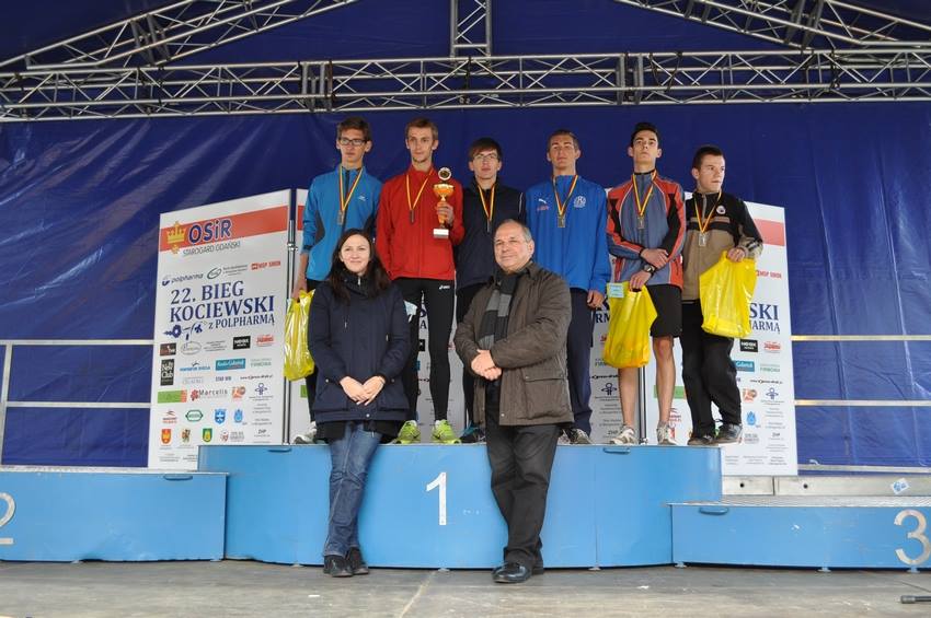 Teraz kilka słów o Kociewskim. Taktykę na bieg obmyślałem przez kilka dni, by w nocy przed biegiem dowiedzieć się o zmienionej, dłuższej trasie niż zeszłorocznej. Nowa miała długość 1850 metrów i podbieg na końcówce podczas wbieganiu na starogardzki rynek. Na starcie stanęło zaledwie 30 osób, ale wśród nich znaleźli się koledzy z kolejno 2. i 3. miejsca z przełajów. Także znów byłem nastawiony na mocniejsze bieganie. Po wystrzale startera ruszyliśmy. Teraz postanowiłem schować się za Patrykiem. Tak też zrobiłem. No i przez 1km biegliśmy dużą grupką, w której znaleźli się Arek Różek (KKB), Krystian Zander (KKB), Mikołaj (LLKS), Patryk no i ja :) Po dość wolnym pierwszym kilometrze w około 3:20, wraz z Patrykiem postanowiliśmy trochę podkręcić tempo by zgubić ogon. Na zbiegu na ulicy Sobieskiego trochę przyspieszyliśmy, lecz nasza przewaga nie wzrosła zbyt mocno. Więc od ulicy Kanałowej, skąd było jakieś 600 metrów do mety, postanowiłem zerwać. Mocno zerwać. Przez kilkanaście metrów trzymał się za mną Patryk, lecz po chwili zwolnił. Zabawna sytuacja miejsce miała na zakręcie na wcześniej wspominany podbieg na rynek. Policja prowadząca bieg chyba nie zauważyła, że mocno przyspieszyłem i zamiast oni jechać przede mną, ja biegłem koło nich :) Po chwili oczywiście mocno przyspieszyli i spokojnie dobiegłem na metę jednocześnie wygrywając :)W nogach znów nie poczułem tego biegu, pewnie przez ten pierwszy wolny kilometr. Dekoracja i wręczenie pucharu z rąk MONIKI PYREK, naszej najlepszej tyczkarki, była czymś wyjątkowym :)