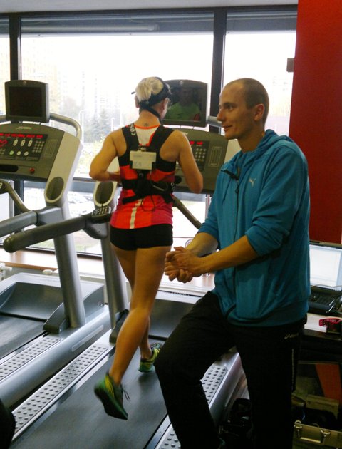 Bieżnia została wprawiona w ruch. Na początek małe rozbieganie, by w następnej fazie biec z coraz większą prędkością, zwiekszaną co 3 minuty. Dr Szczepan Wiecha z SPORTSLAB czuwał przez cały czas nade mną i ... dopingował, kiedy chciałam odpuścić. Zakończyłam badanie po około 17 minutach. Podczas testu monitorowano zużycie tlenu (VO2), wydychanie dwutlenku węgla (VCO2), częstość i głębokość każdego oddechu oraz tętno.
