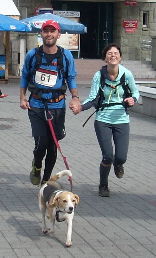 Po zawodach w Przesiece szybko doszliśmy do siebie. Minął tydzień i organizatorzy uruchomili formularz zgłoszeniowy do ostatnich zawodów sezonu 2013. Tym razem przygotowali dla nas trasy beskidzkimi szlakami, a całość imprezy zaczynała i kończyła się w Wiśle. W sobotę rano zapakowałem Sonię, Frytkę i torby do auta i pojechaliśmy do Cieszyna po mojego tatę. Wszyscy razem pojechaliśmy do Wisły. Była godzina 8:45. Sonia nie chciała wychodzić z auta, żeby się nie wychłodzić. Na zewnątrz było dość chłodno. Wzięliśmy więc Frytkę i poszliśmy na odprawę weterynaryjną. Miejsce startu i mety było zlokalizowane na samym rynku, tak samo jak biuro zawodów. Gdy czekaliśmy na swoją kolejkę przyszło oberwanie chmury. Na szczęście biuro zawodów było pod dachem i nikt nie zmókł. Na rynku były porozstawiane namioty, w których można było się schować przed szalejącym deszczem. Otrzymaliśmy numer startowy 61 oraz pakiet startowy. Poczekaliśmy pod namiotem kilka minut i deszcz przestał padać. Poszliśmy do samochodu. Zabraliśmy Sońkę i poszliśmy się przejść. Skorzystaliśmy z toalety pogadaliśmy z dogtrekkingowcami i poszliśmy się przebrać. Przez Wisłę znowu przetoczyła się nawałnica. Po raz trzeci i na szczęście ostatni deszcz spadł o godzinie 9:30. Z niecierpliwością czekaliśmy na rozdanie map i odprawę przed startem. Frytka była dość spokojna pomimo dużej ilości psów, które przewijały się koło niej. W końcu hostessy rozdały mapy. Paweł objaśnił całą trasę dla dystansu mid i mini. Longi były już na trasie. Tata zapisał nam najważniejsze szczegóły. Byliśmy gotowi do startu. Przeszliśmy z Sonią i Frytką na linię startu. Na początku wszyscy mieli biec za Pawłem, który będzie poruszał się na rowerze. Ostry start nastąpi dopiero po opuszczeniu ścisłego centrum miasta. W uczestnikach i ich psach można było wyczuć duże podniecenie. Ostatnie odliczanie i wystrzeliliśmy jak z procy. Jak zwykle najostrzejsze psy zaczęły się na siebie rzucać. Dobrze, że Frytka w takich momentach jest raczej przestraszona i nie prowokuje niepotrzebnych spięć. Jako jedni z pierwszych podążaliśmy truchtem za Pawłem. Z rynku skierowaliśmy się w stronę amfiteatru. Wąskim mostkiem przekroczyliśmy rzekę przy basenie i skręciliśmy w prawo. Po kilkuset metrach byliśmy pod ośrodkiem Startu. Dalej biegliśmy wzdłuż Wisły. Po kolejnych kilkuset metrach dobiegliśmy do mostu i drogi na Malinkę. Tutaj skręciliśmy w prawo na most. Organizatorzy zadbali o uczestników i ruch kołowy został zupełnie wstrzymany. Z mostu przez rondo pobiegliśmy w kierunku Dziechcinki. Tutaj nastąpił ostry start i wszyscy ruszyli swoim tempem. Starym zwyczajem zostaliśmy trochę z tyłu. Najlepsi biegacze byli przed nami. Ciągle truchtając podążaliśmy przed siebie asfaltową drogą. Po kolejnych kilkuset metrach skręciliśmy w lewo na niebieski szlak turystyczny. Zaczęliśmy pierwsze podejście. Raz my kogoś wyprzedzaliśmy, żeby po jakimś czasie ktoś wyprzedził na. Przeszliśmy przez tory. W tym miejscu wyprzedzili nas Basia i Sławek ze swoim Baldurem. W Soni uruchomiła się wola walki i trochę przyspieszyła. Nie chcieliśmy zostać za bardzo w tyle za jednymi z naszych głównych konkurentów. Trzymaliśmy się razem. Pod górę zostawaliśmy w tyle. Po płaskim znowu ich doganialiśmy. Zza chmur wyszło piękne słońce i zaczęło mocno grzać. Sonia w końcu się rozgrzała i ściągnęła kurtkę. Wzdłuż szlaku była cała masa ogromnych muchomorów. Dzielnie maszerowaliśmy pod górę. Pierwszy punkt kontrolny organizatorzy umiejscowili na drzewie zaraz nad skałkami. Hasło brzmiało „Kobyla”, trzeba było również odbić perforator. W tym punkcie powróciły do mnie wspomnienia. W czasie liceum i oraz początkiem studiów często jeździliśmy w te rejony ze znajomymi. Skałka zwana właśnie Kobyla to doskonałe miejsce na rozpoczęcie przygody ze wspinaniem. Jest to około dziesięciometrowa skała, która oferuje drogi bardzo łatwe jak i średnio trudne. Jest tam kilka dróg, które można zrobić z asekuracją dolną – dla bardziej zaawansowanych. Jest tam również cała masa drzew na górze i oczywiście możliwość bezproblemowego tam wejścia aby wspinać się z asekuracją górną. Kobyla oferuje również dziesięciometrowy, ciekawy boulder, na którym można pomęczyć się bez asekuracji. Doskonałe miejsce, mało uczęszczane, z możliwością noclegu w namiocie na polance u góry jest świetnym miejsce na weekendowy wypad. Oczywiście dróg jest tylko kilka ale i tak człowiek może się porządnie zmęczyć. Powyżej pierwszego punktu kontrolnego minęliśmy potężne pastwiska. Niebieskim szlakiem wspinaliśmy się w górę aby po kilkunastu minutach dojść do szlaku żółtego, którym dotarliśmy do szlaku czerwonego – Głównego Szlaku Beskidów. Byliśmy na Stożku Małym i przed sobą mieliśmy najcięższe zadanie dzisiejszego dnia – wdrapanie się na Stożek Wielki. Na początku był bardzo szybki zbieg – pędziliśmy jak szaleni. Po kilkuset metrach jednak rozpoczęło się mozolne i bardzo strome podejście. Czuliśmy jak krew pulsuje w naszych żyłach. Cierpieliśmy. Frytka natomiast jak zwykle szła przed siebie merdając wesoło ogonkiem, węsząc na lewo i prawo. Skąd ona bierze tyle siły? Dwieście metrów przed schroniskiem na Stożku odpiąłem Frytkę i dałem smycz Soni. Pobiegłem przodem, żeby szybko i sprawnie załatwić drugi punkt kontrolnym, który był w schronisku. Przed samym schroniskiem wyprzedziłem Basię i Sławka. Wpadłem do środka i jak szalony pognałem do środka. Tam dowiedziałem się, że pieczątka, którą mamy przybić jest przy samym wejściu. Szybko się wycofałem i znalazłem pieczątkę. Gdy wyszedłem ze schroniska Soni i Frytki jeszcze nie było. Po kilku minutach do mnie dołączyły i bez chwili od