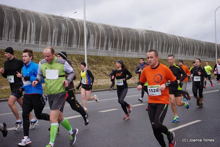 W niedziele na miejsce przyjechałem około 30 minut przed biegiem. Co chwila padający deszcz plus mocne porywy wiatru nie nastawiały mnie optymistycznie. Krótka 1,5 km rozgrzewka i zameldowałem się na starcie. Nie było widać żadnej bramy i napisu start, pewnie z obawy przed tym wiatrem nie została postawiona. Wszyscy wokoło pytają w którą stronę biegniemy, jak się za chwilę okazało jednak nie w tą, w którą wszyscy sądzili. Dalej zachowuję luz :) Chcę się skupić tylko na tym, żeby rozsądnie zacząć nie tracą za dużo sił na pierwszych kilometrach (które jak się okazało później były głównie pod wiatr). Ustawiam się blisko końca (co było w świetle późniejszych zdarzeń majstersztykiem), odliczanie organizatorki i ruszamy.