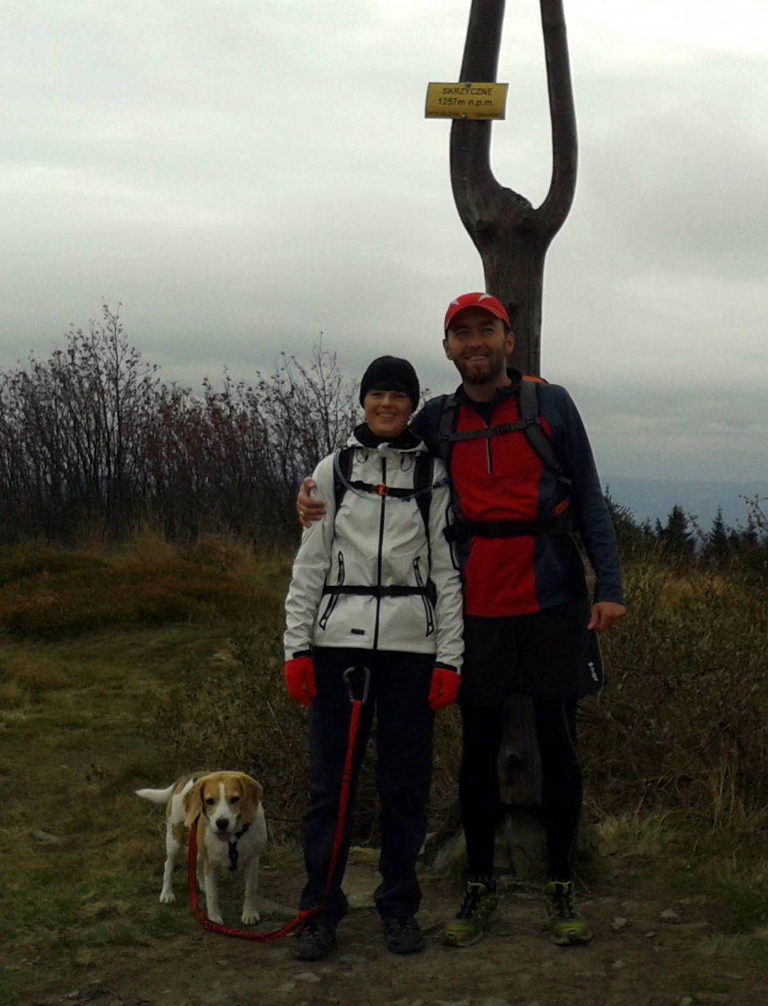 Po zakończeniu sezonu dogtrekkingowego imprez± w Wi¶le postanowili¶my, że musimy z Soni± i Frytk± zdobyć jeszcze jeden szczyt do Korony Gór Polski. Nasz wybór padł na Skrzyczne, czyli najwyższy szczyt Beskidu ¦l±skiego. Wybrali¶my się więc do Szczyrku. Przy okazji wyjazdu zabrali¶my ze sob± moich rodziców i Soni mamę. Nasi nestorzy mieli spacerować w centrum, a my od razu ruszyli¶my w górę niebieskim szlakiem. Po kilkuset metrach skręcili¶my w prawo i weszli¶my na w±sk±, strom± ¶cieżkę. Na szlaku było trochę turystów lecz nie przeszkadzało nam to w utrzymywaniu własnego tempa. Jednostajnym, szybkim krokiem szli¶my w górę. Bez problemów dotarli¶my na szczyt. Zrobili¶my pami±tkowe zdjęcie i przybiłem do ksi±żeczki zdobywców korony gór Polski schroniskowe piecz±tki. Sonia czekaj±c na mnie z Frytk± przed schroniskiem trochę zmarzła i z mił± chęci± zaczęli¶my zbiegać. W okolicach Hali Jaworzyny Sonia miała mały kryzys i musieli¶my się zatrzymać. Po kilku minutach odpoczynku ponownie ruszyli¶my w dół. Na pocz±tku szybkim marszem a póĽniej znowu ile fabryka dała. Po około 30 minutach byli¶my przy samochodzie. Rodzice po kilku minutach dotarli do nasz i cał± ekip± wrócili¶my do domu.