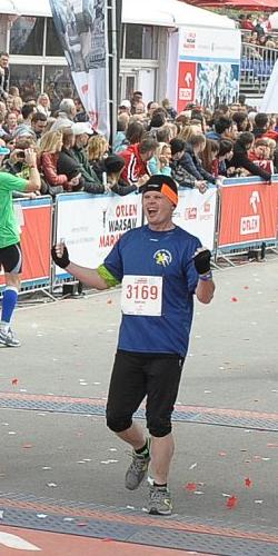 Ściany do samego końca nie było, ale zaraz za tabliczką "32km" poczułem się dość słabo i zwolniłem, i to znacznie, bo to jeszcze dyszka do końca. Tempo spadło do 6:40/km i czułem, że długo tak nie pociągnę. Postanowiłem, że polecę tym tempem maksymalnie długo, a resztę dystansu przejdę - po co się zarzynać, ściana jest najwyraźniej tuż, tuż? Zresztą i tak zrobię życiówkę. :-D Tak myśląc dobiegłem jakoś do tablicy "38km". Zerknąłem na stoper - od lini startu równo 3h36min0sek. Czyli 24 minuty by dobrnąć do mety i złamać 4 godziny, a nie mam już siły. I wtedy odezwała się moja wkurwiona ambicja. Głos w głowie powiedział: "Wczoraj z wózkiem biegłeś w tyle czasu pięć kilometrów, to czwórki nie przebiegniesz? Jeśli nie teraz, to nigdy! Nigdy kurwa! Ogarnij się!". Miałem polemizować z wkurwioną ambicją? Bez sensu. Zresztą w zasadzie jestem już prawie na mecie, więc te cztery kilometry to bułka z masłem. I jakimś cudem zaczynam znowu biec tempem zbliżonym do tego, jakie miałem przez większość dystansu. Mijając czterdziesty kilometr zostaje 12 i pół minuty do czterech godzin, więc jeszcze przyspieszam. Gdy wpadam na ostatnią prostą wiem, że się uda i ostatkiem sił docieram na metę. Zerkam na stoper - 3:58:51 ( wynik na stronie biegu minimalnie lepszy ). Plan wykonany. I wszystko dzięki wkurwionej ambicji. Jak to często mawia jeden znajomy - biega się głową. Coś w tym chyba jest. ;-)