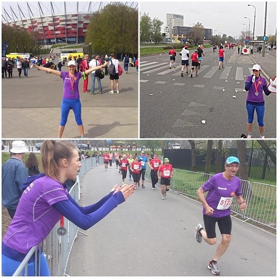 Dojeżdżamy tramwajem na 30-sty kilometr trasy, 100m od hotelu, w którym spaliśmy. Obok nas przebiegają osoby na wynik ok. 3:20. Szybko wyciągam papierową trąbkę podarowaną przez wolontariuszki, ubieram fioletową koszulkę i zaczynam kibicowy rytuał. Staram się uśmiechać (dmuchając jednocześnie w trąbkę – arcytrudna czynność) do zmęczonych twarzy biegaczy; do tych, których znam, krzyczę po imieniu, ksywie, nazwie miejscowości. Mijają mnie bohaterzy. Każdy z nich jest inny, mają różne numery, różne koszulki, przeróżne style biegania – wyprostowani, zgarbieni, pronatorzy i supinatorzy, jedni szaleńczo wymachują rękoma, inni trzymają je przy sobie. Jedni słuchają muzyki, inni mają okulary, jeszcze inni czapki. Każdy inny, a przecież każdy taki sam. Biegacz. Bohater. MARATOŃCZYK! Starają się odwzajemnić uśmiechy, klaszczą, podnoszą kciuki, a dla mnie to miód, wiem, że w jakimś, choć malutkim procencie im pomogłam i to czyni mnie szczęśliwą. Mija mnie niesamowita Gerappa, którą podziwiam już od 3 lat, Bartek krzyczący „Hej Honda!”, kilka osób z Grodziska, Wolsztyna, Chyżaków. Jest i Łuciu w bluzce Lecha Poznań, przytulam go i całuję, a on leci dalej. Moja trąbka zaczyna się psuć, usta bolą od dmuchania, ale nie przestaję. Jest tata, biegnę z nim ok. 200m, nie czuje się zbyt dobrze, idzie na przemian z biegiem. Staram się go jakoś zmotywować, jednak jest dość uparty. Klepię go po plecach i mówię, że będę czekać na niego na mecie. Chwilę potem mija mnie Anita, która pięknie biegnie, życzę jej powodzenia i wracam.