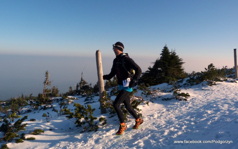Bardzo fajna prezentacja biegowa, interesujące wspomnienie Tomka Kowalskiego i spanko. Rano po sprawdzeniu obowiązkowego wyposażenia – na start. Ruszamy w Karpaczu grubo, jak w zawodach na 10km na płaskim. Potem las i fajny, długi, ale dość łagodny podbieg. Przesuwam się do przodu. Zaczyna się najtrudniejszy technicznie zbieg na trasie, czyli moja pięta achillesowa. Idzie zaskakująco nieźle aż walę głową w gałąź. Zsuwa mi się czołówka i okulary. Poprawiam wszystko i okazuje się, że…okulary całe zaparowały. Jedyna metoda to biec – przecieranie nic nie daje. A że jest ciemno i stromo to bardziej schodzę niż biegnę. Prawie włażę po kolana do wody, bo nie widzę mostka po którym można przekroczyć strumień. Ludziska mijają mnie jak malucha na niemieckiej autostradzie. W końcu odyskuję wzrok i ruszam. Mimo, że nikogo w okolicy nie widzę i nie słyszę to wiem, że dobrze biegnę, bo trasa oznaczona znakomicie (no i robiłem niedawno jej rekonesans). Na końcu asfaltu doganiam kilku biegaczy i ruszamy pod górkę. Znowu mijam. Lubię takie podbiegi – długie, bez wypłaszczeń. Zyskuję kilka pozycji aż do Przełęczy Okraj mimo krótkich postojów wymuszonych różnymi okolicznościami (w końcu to pora porannego sikania; dziękuję też koledze za informację, że mam całkiem rozpięty plecak – dzięki temu uratowałem jego zawartość).