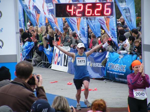 Z daleka widzę Bramę Brandenburską - biegniemy do niej. Jest coraz bliżej. Wielka, majestatyczna. Dla mnie to brama do triumfu. Przebiegłem ponad tysiąc kilometrów w tym roku, by wbiec w tę bramę. I wbiegam. Oczy oczywiście są załzawione. W brami biegacze krzyczą, a potężne echo znów ogłusza. Zaraz za bramą oznaczenie kilometra 42. Już!!! Pozostał szpaler zastawiony kibicami krzyczącymi ile sił w gardłach. Widzę bramę na mecie. Zbliżam się powoli, ale nieuchronnie. To się już dzieje poza mną, nie czuję że biegnę, nie czuję żadnej aktywności z mojej strony. Powoli unoszę ręce do góry w geście triumfu. Przyjaciółka oglądając to na filmie powie później, że wyglądam jakbym błogosławił tłumy. Patrzę na zegar - 3:47:xx. BRUTTO!! Przecież marzyłem o takim czasie netto!!!!!